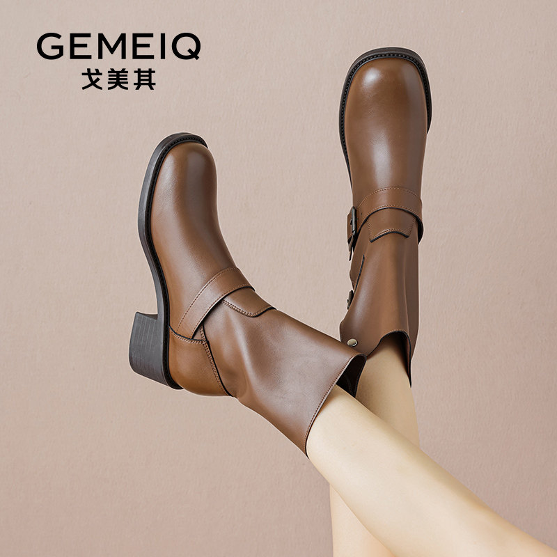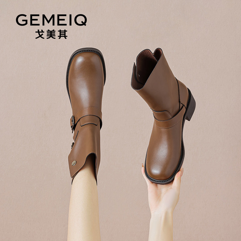 戈美其马丁靴女2025新款春季短筒棕色牛仔靴英伦风显瘦粗高跟短靴