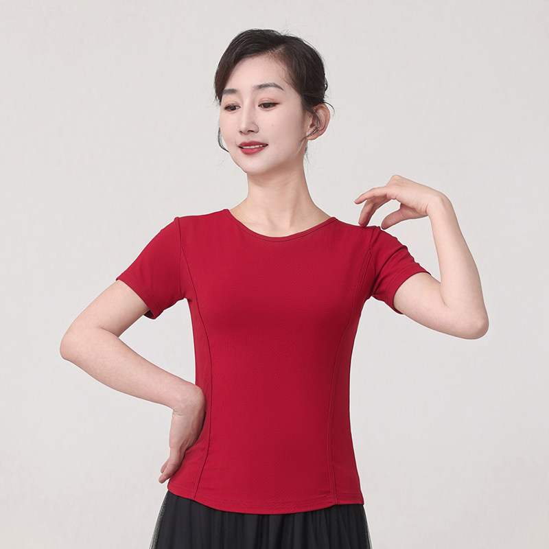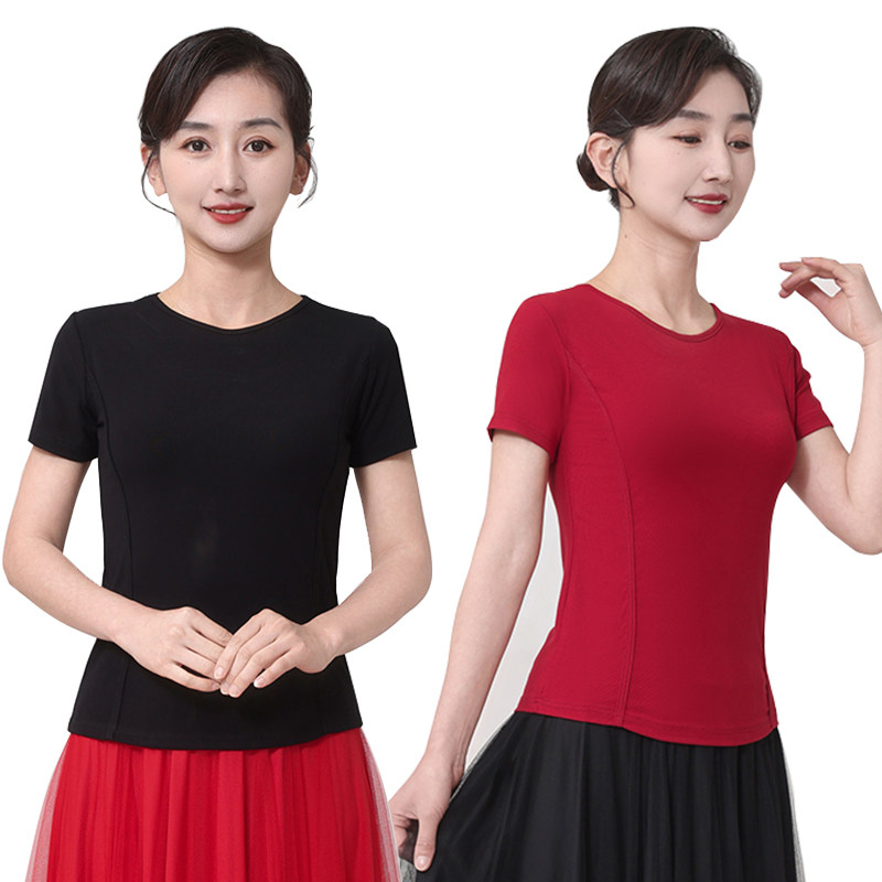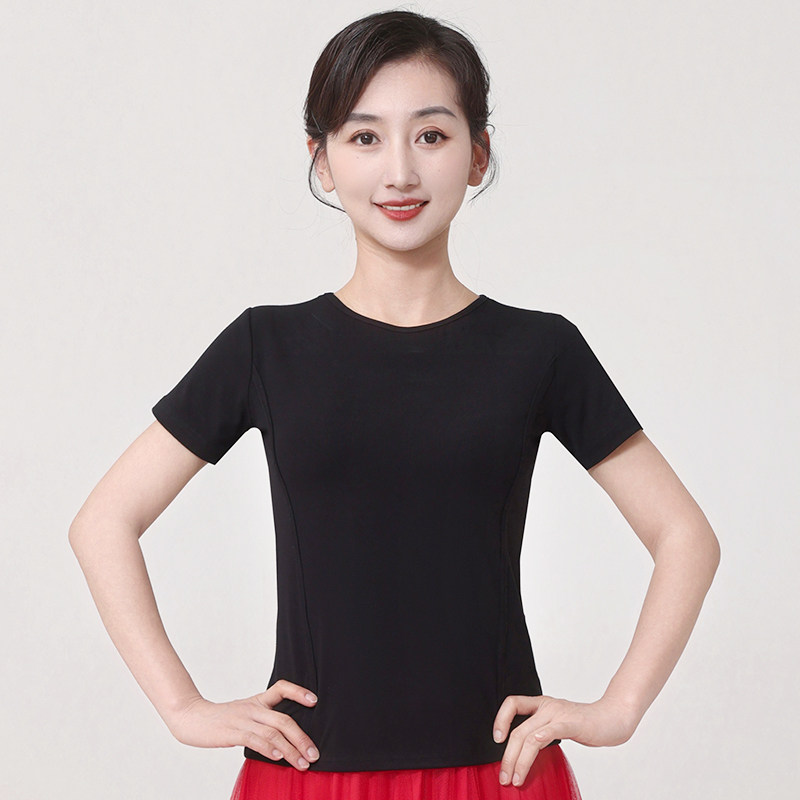 广场舞莫代尔上衣新款短袖t恤女士夏天舞蹈跳舞衣服舞服黑色