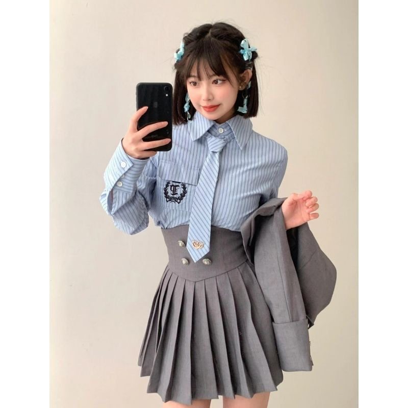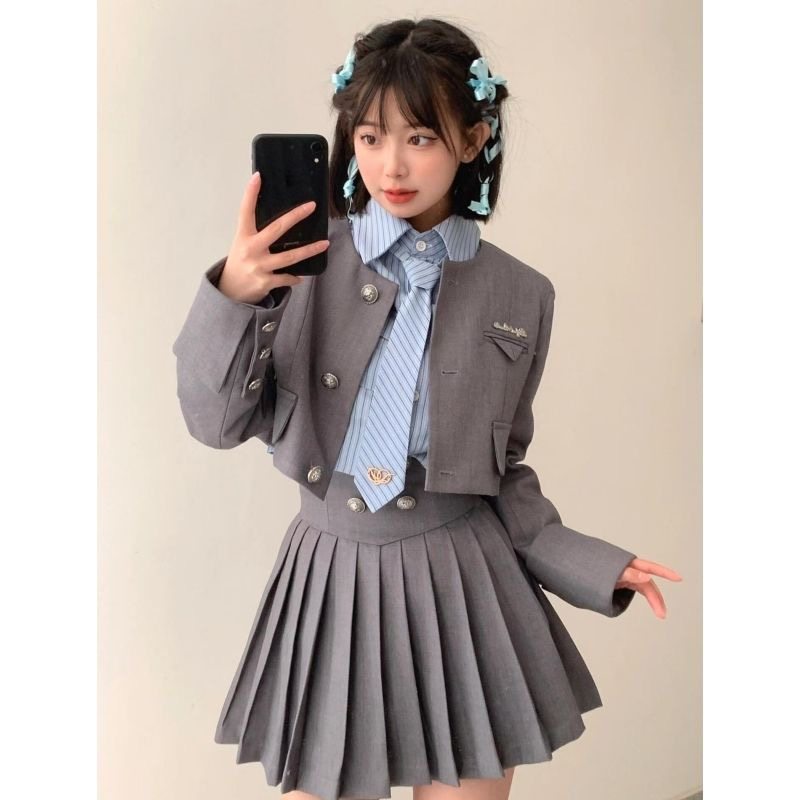 美式学院西装jk制服套装裙女秋季2024灰色西服外套衬衣百褶裙三件
