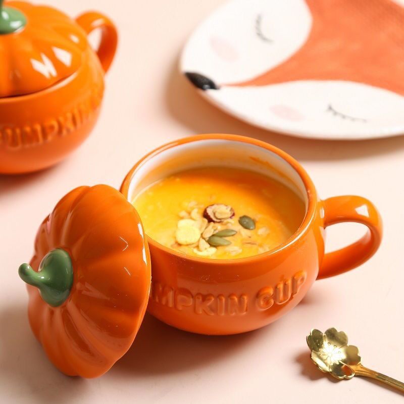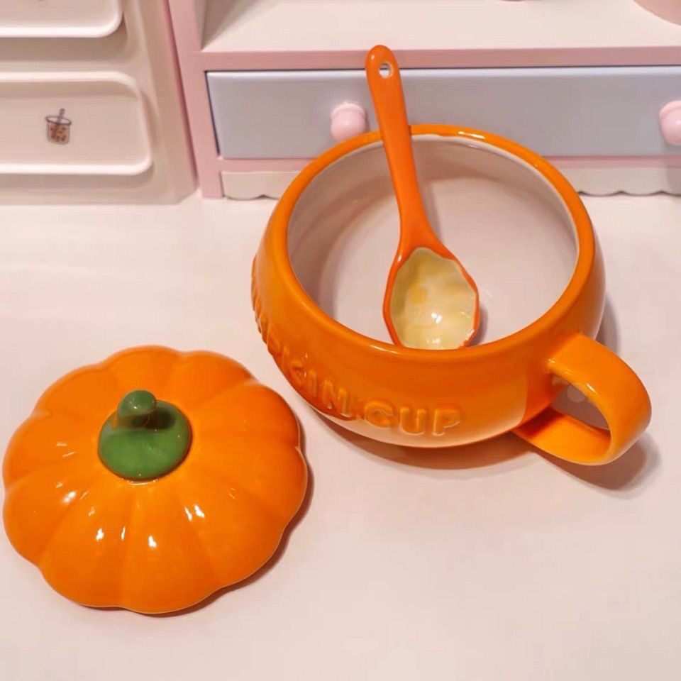 南瓜造型陶瓷马克杯 带盖橙色字母咖啡杯 办公室情侣茶水杯带勺子