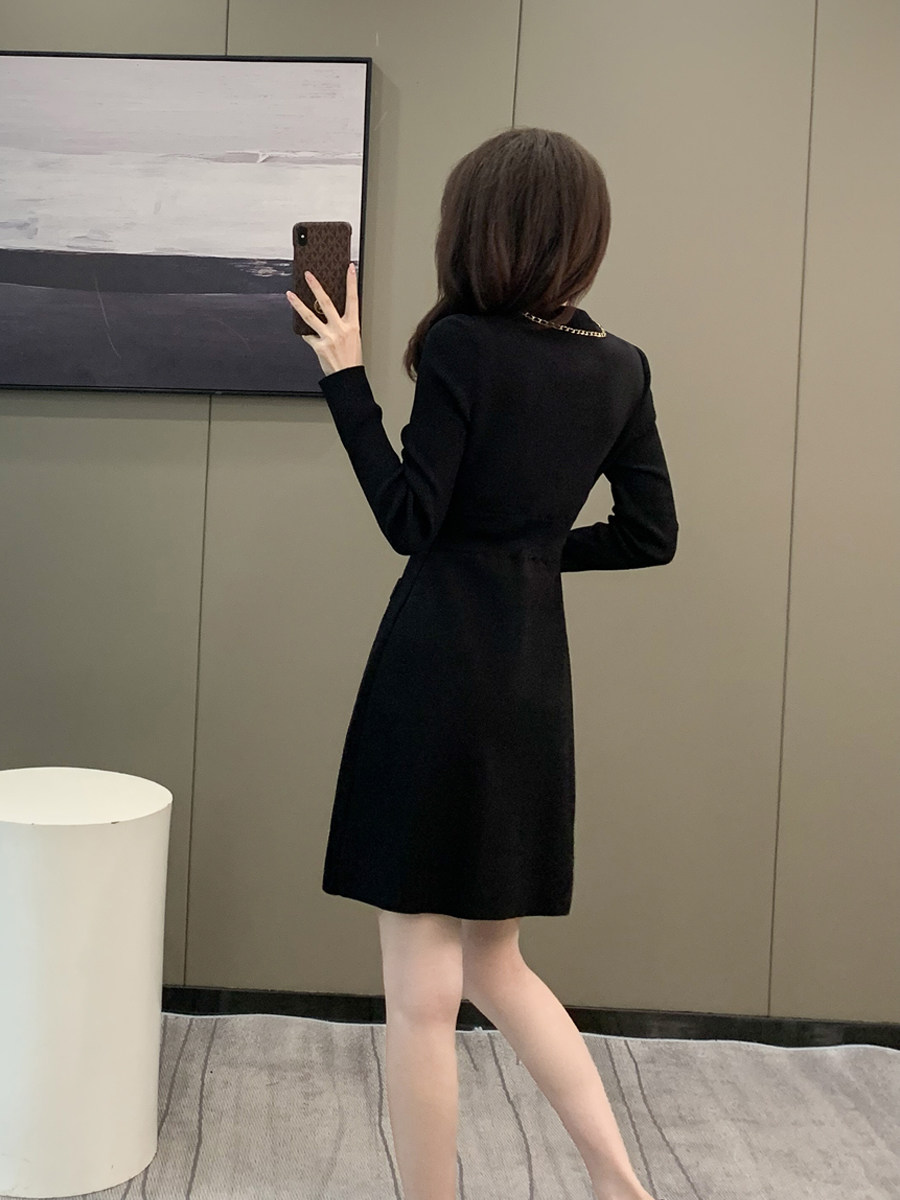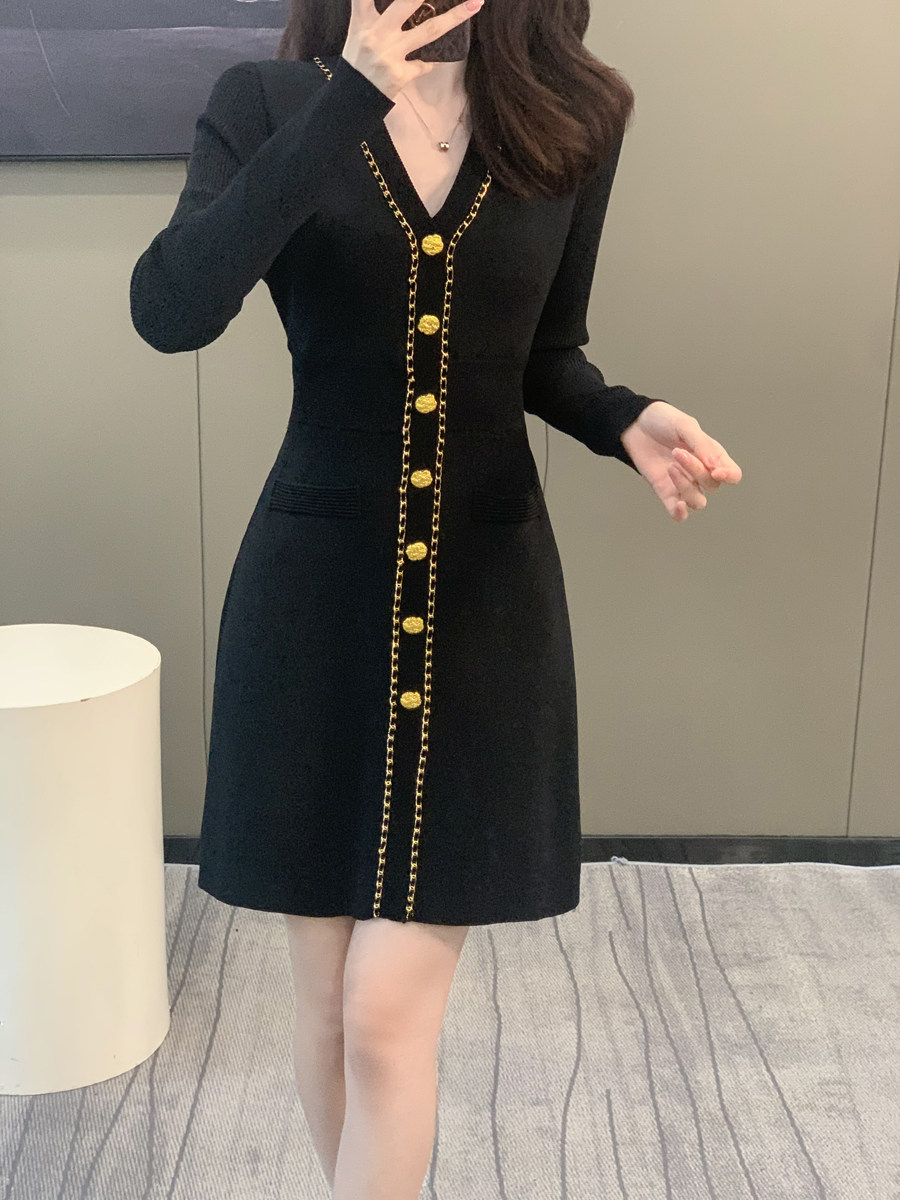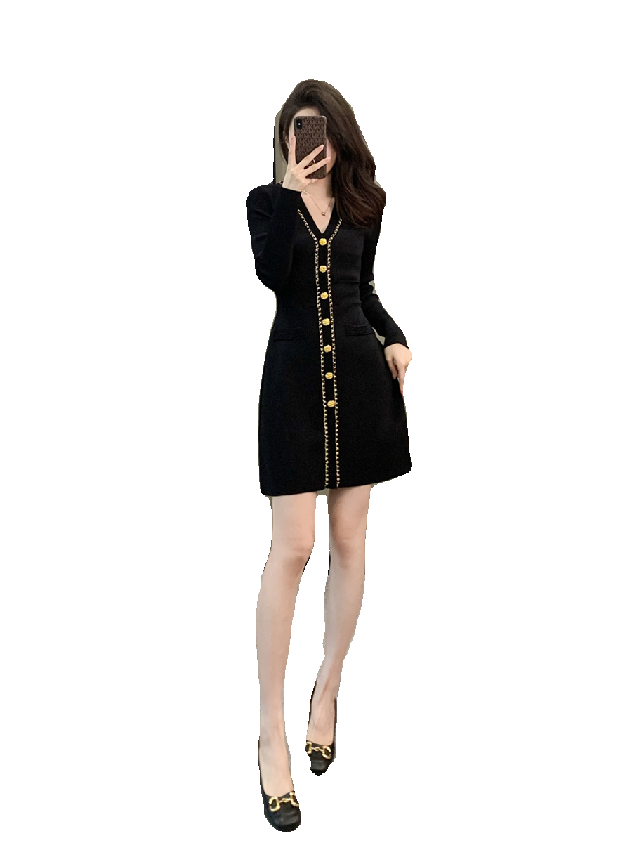 赫本风小黑裙秋冬新款气质优雅V领连衣裙女修身收腰单排扣针织裙