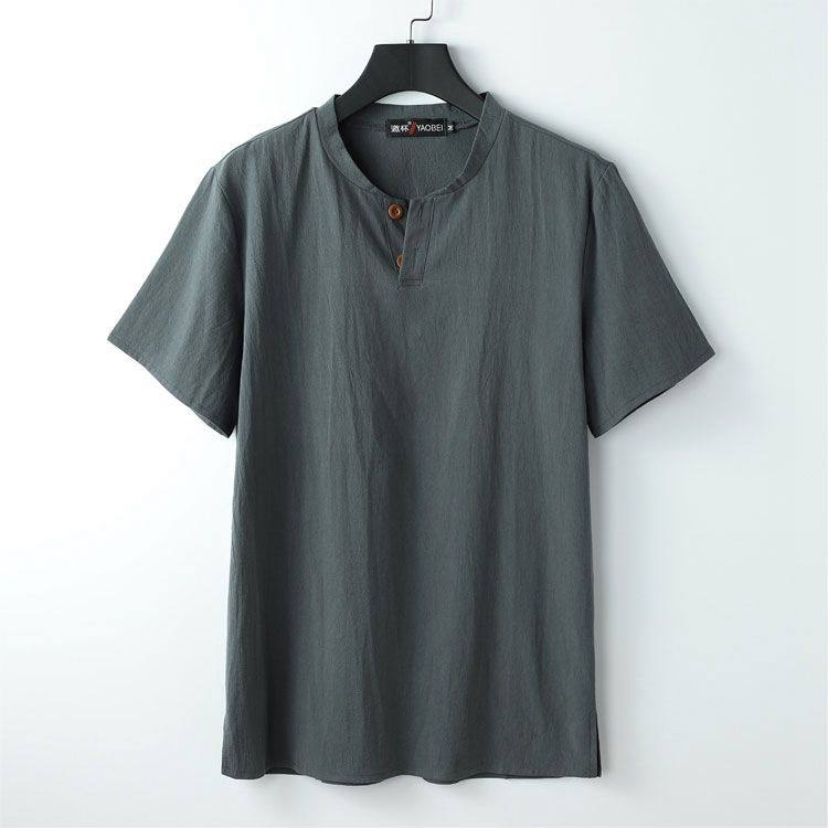 亚麻V领短袖t恤男新中式加肥加大居士上衣胖子中国风棉麻禅修半袖