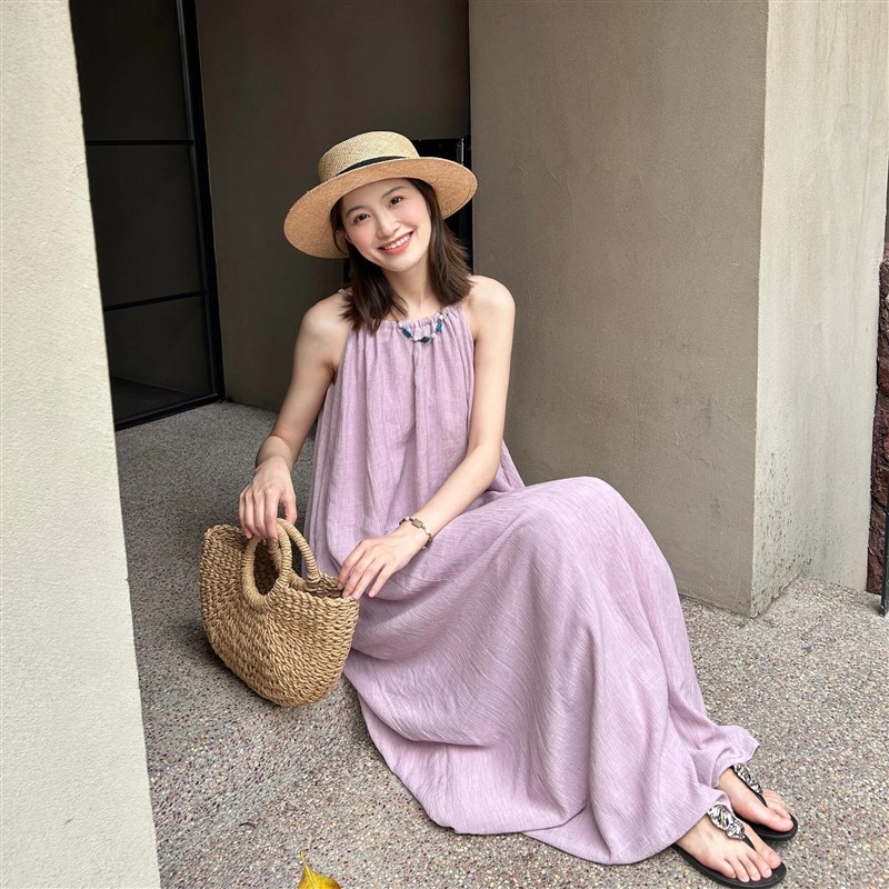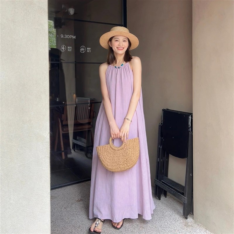 法式气质宽松显瘦紫色A字吊带连衣裙女夏季海边旅游度假沙滩长裙