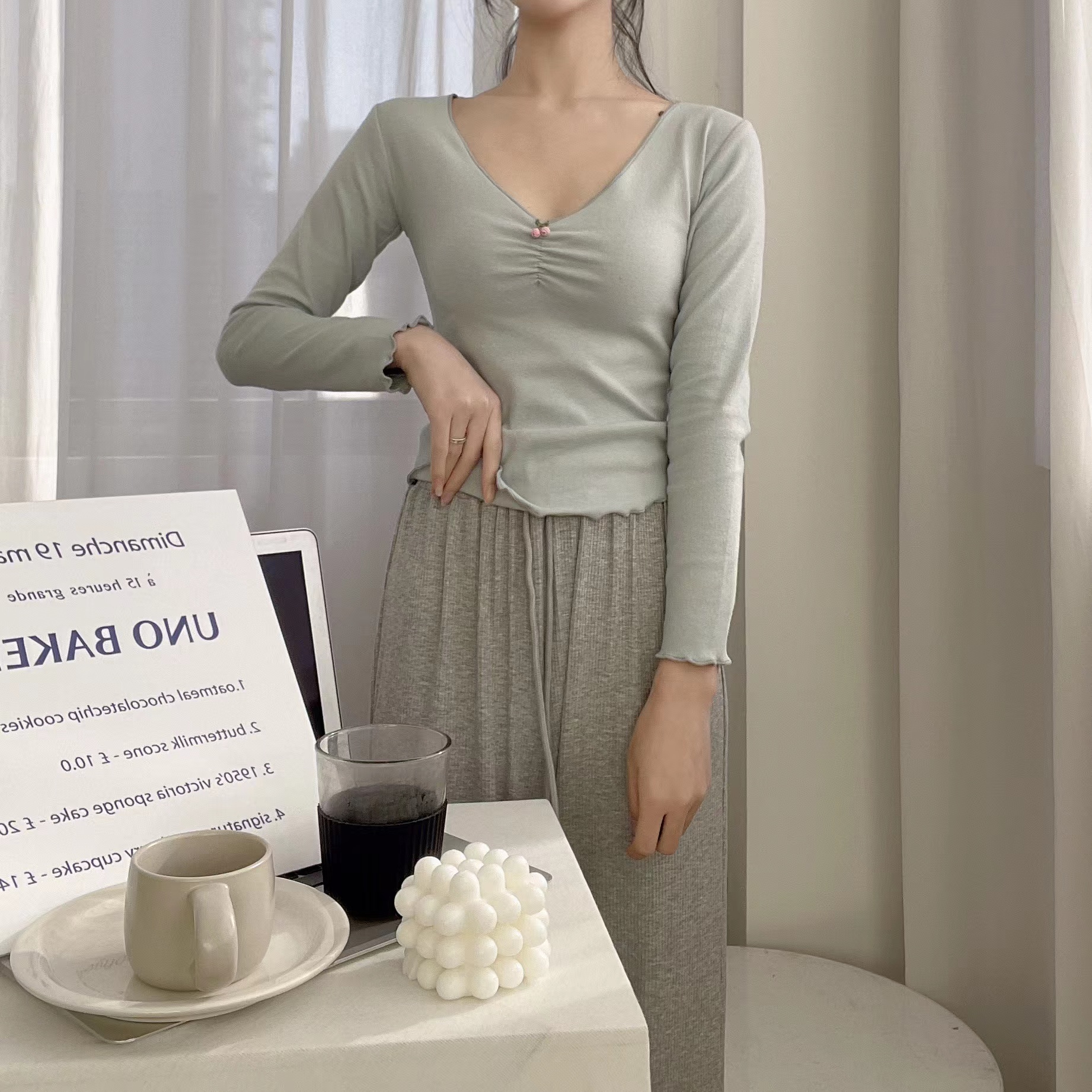 温柔纯欲风显身材v领打底衫温婉气质修身内搭舞蹈长袖t恤瑜伽服女
