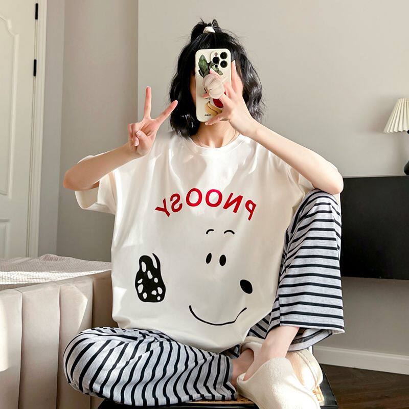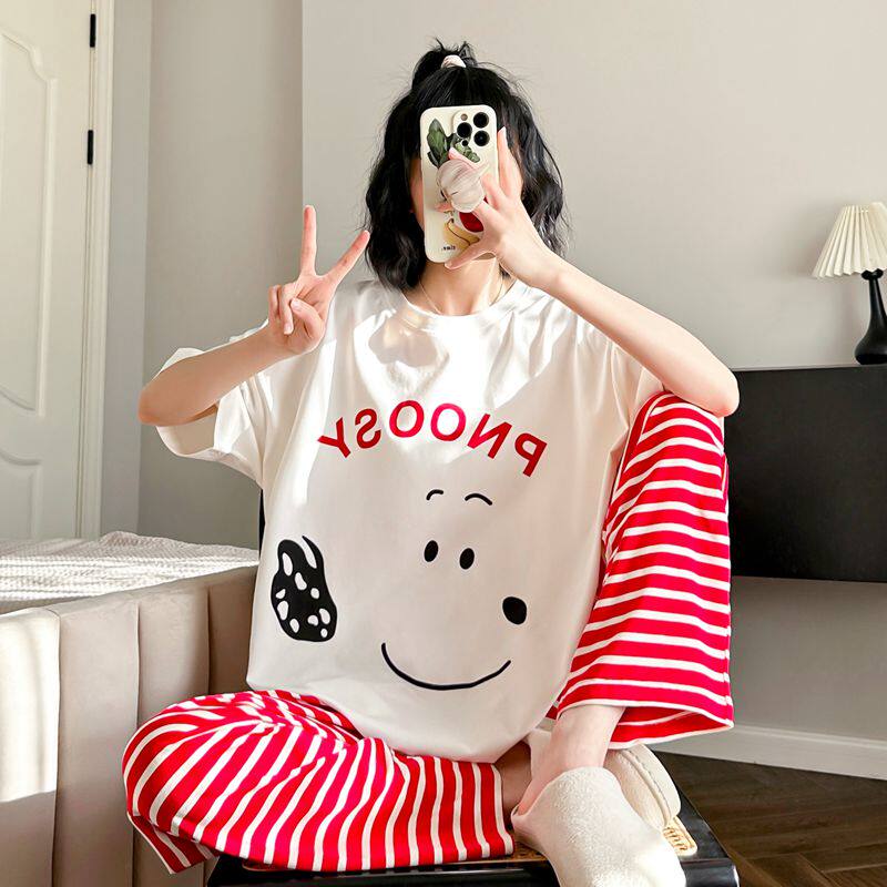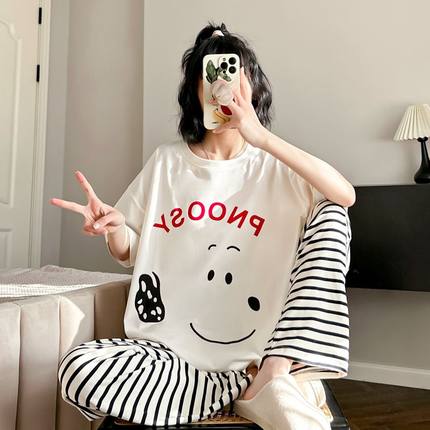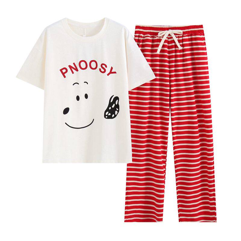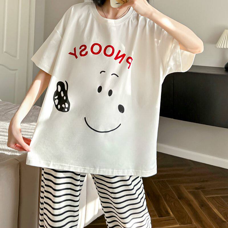 可爱小狗睡衣女春夏季纯棉短袖长裤日系休闲可外穿遛弯条纹家居服