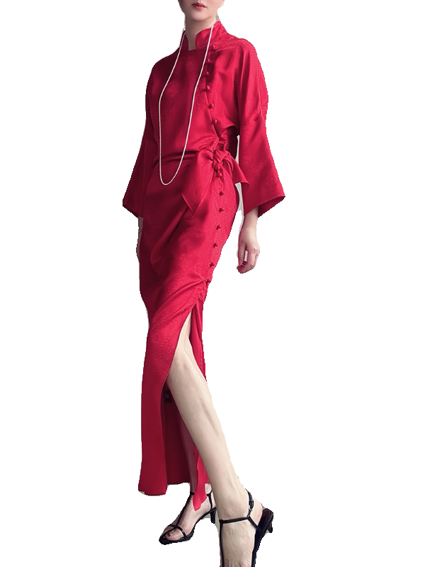 缓圆独家小众精致新中式红色真丝花罗九分袖旗袍裙连衣裙礼服晨袍
