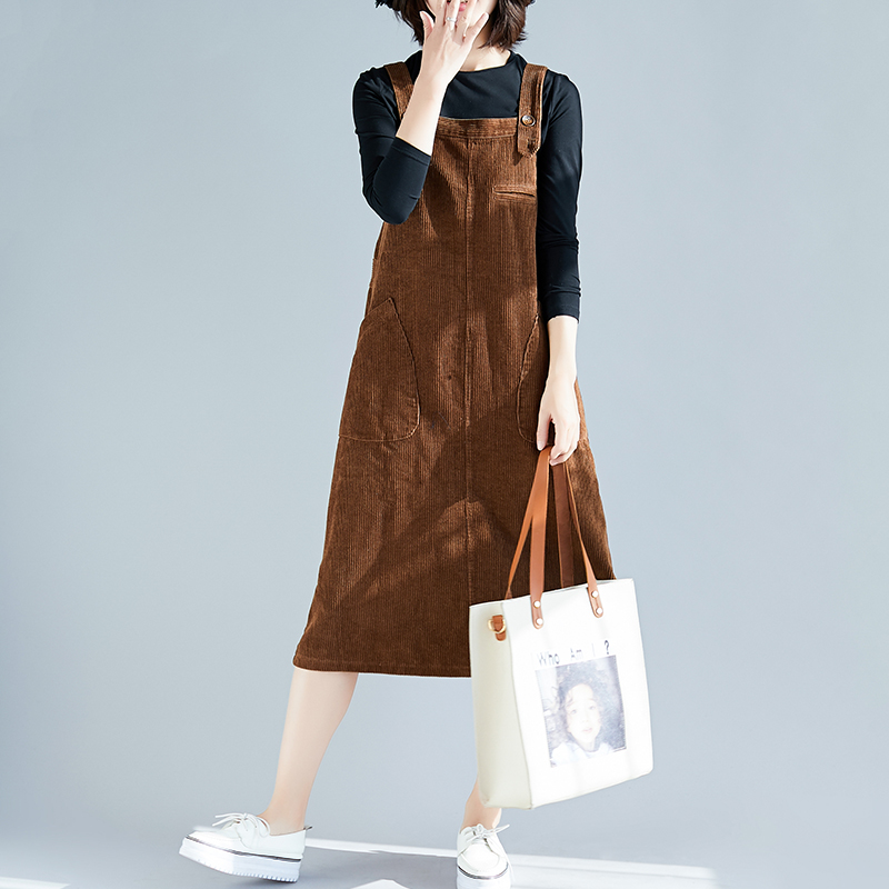 法式复古灯芯绒背带裙女秋冬新款宽松减龄中长款条绒背心连衣裙潮