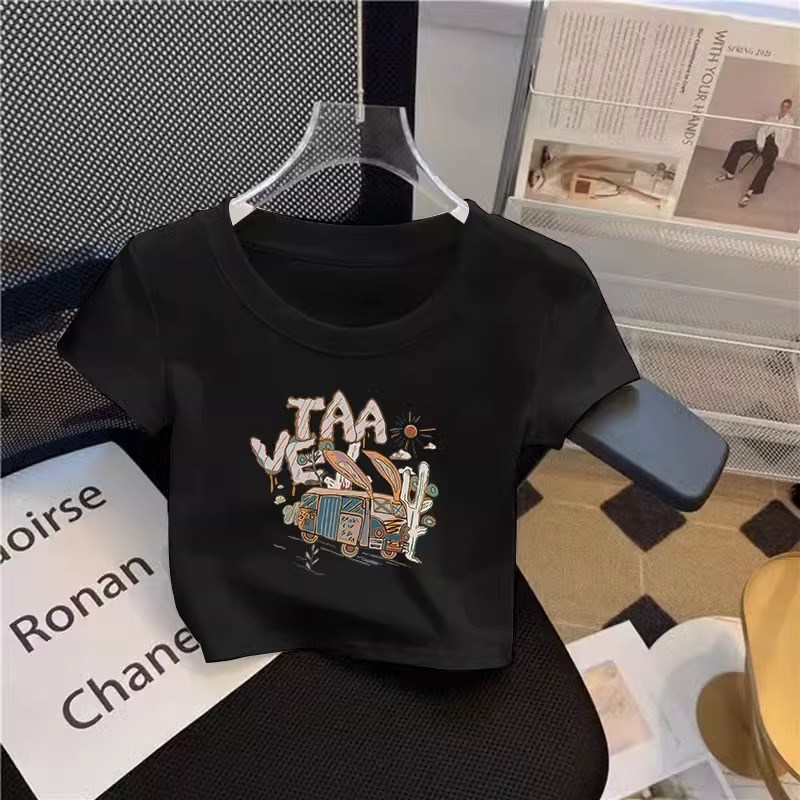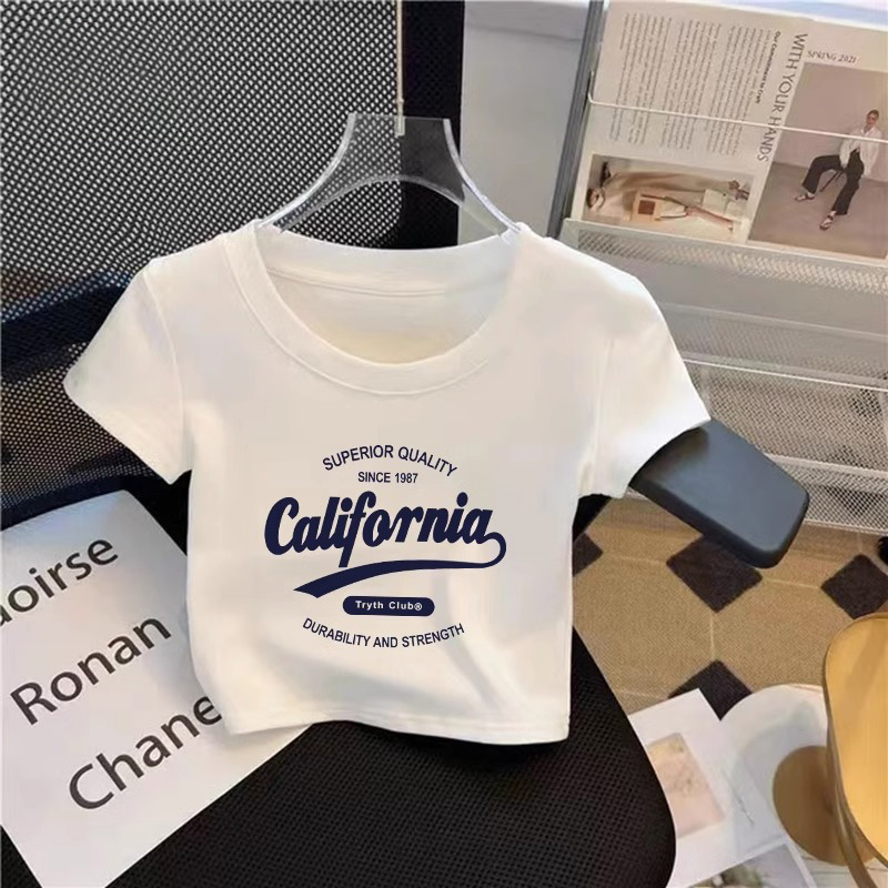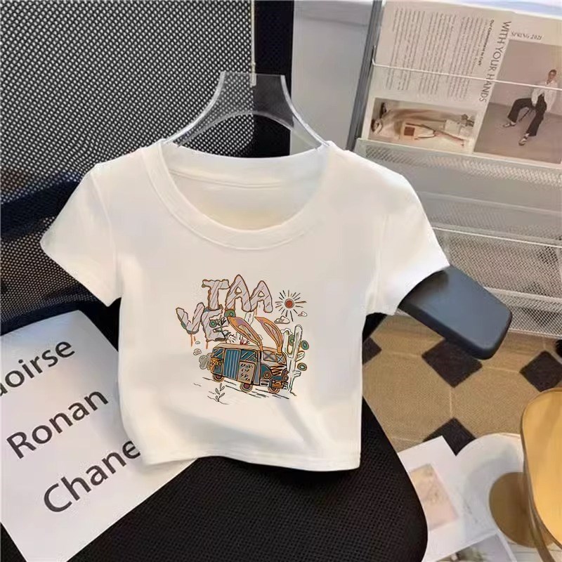 白色正肩纯棉短袖T恤女夏款薄款修身短款露脐印花体恤上衣潮