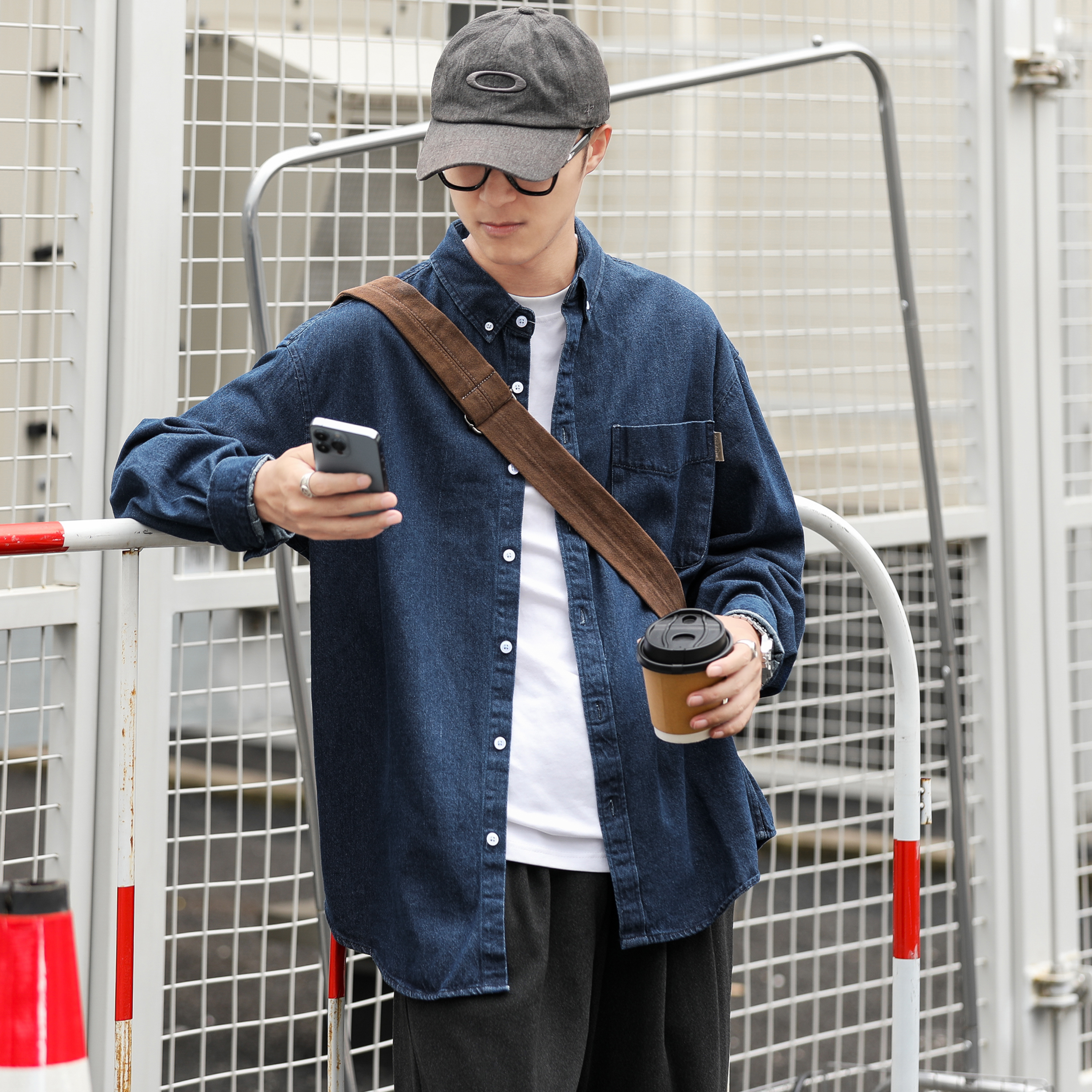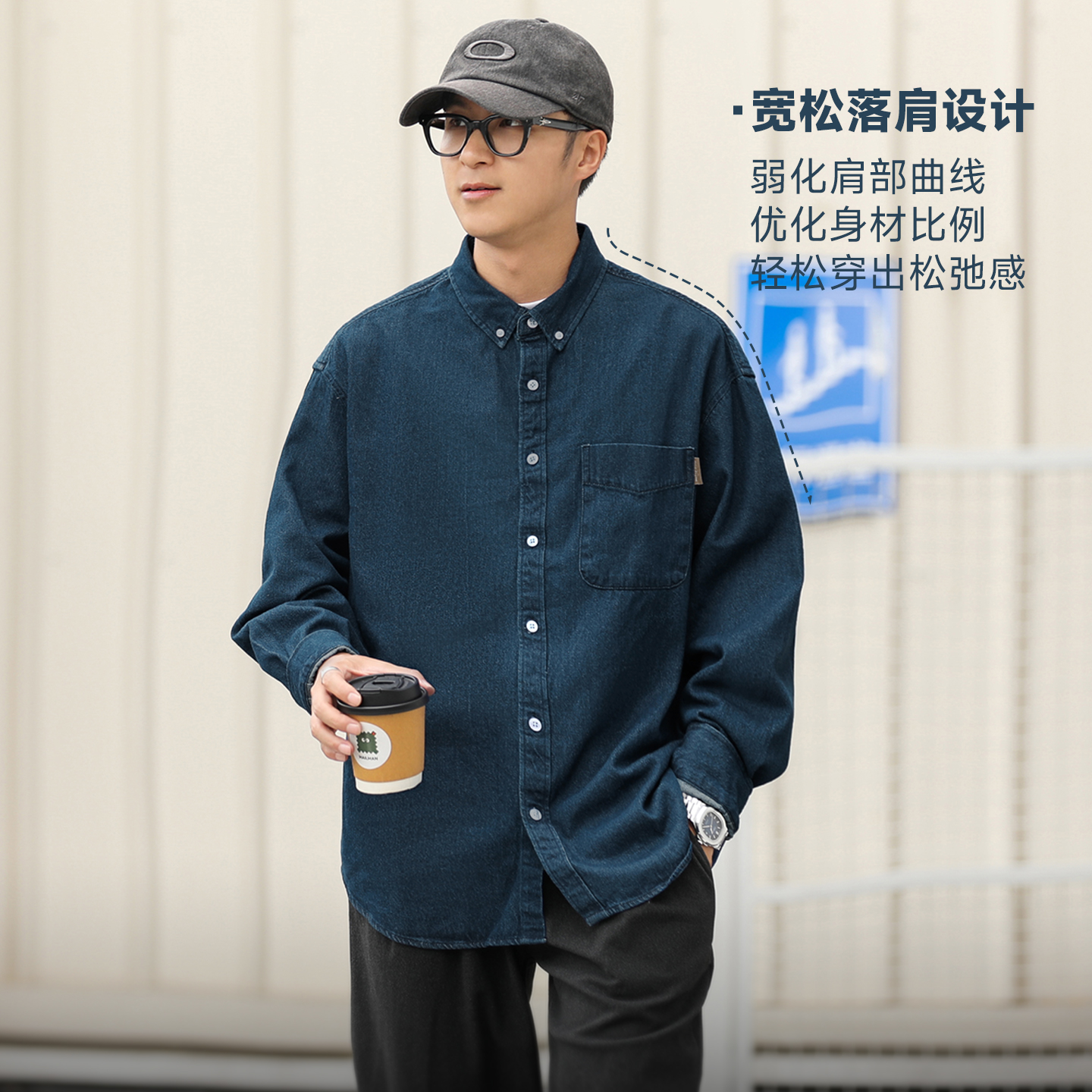 嘿马七作日系复古秋贴袋翻领牛仔衬衫外套男宽松休闲内搭长袖衬衣