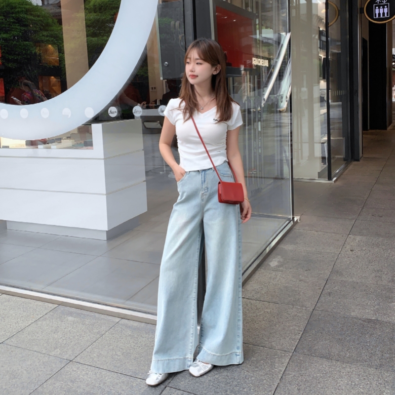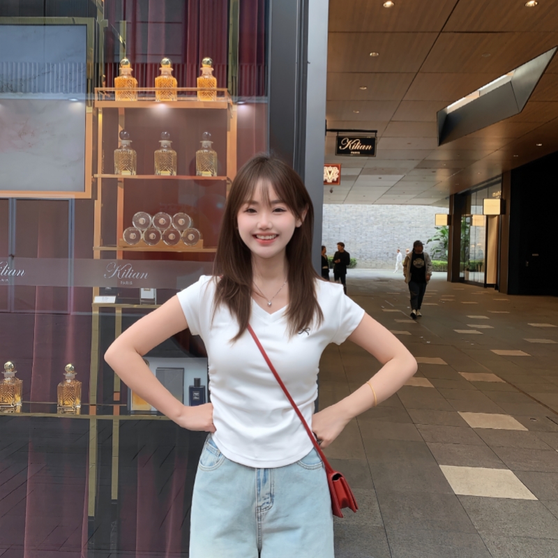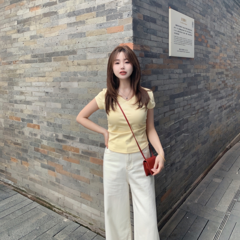 小小家 小个子小码V领短袖修身T恤侧面抽褶25年基础薄款百搭上衣