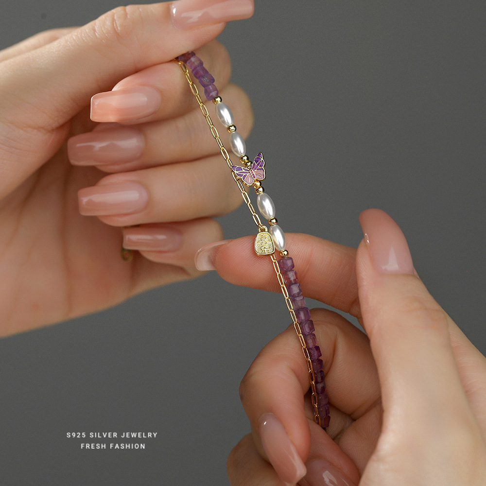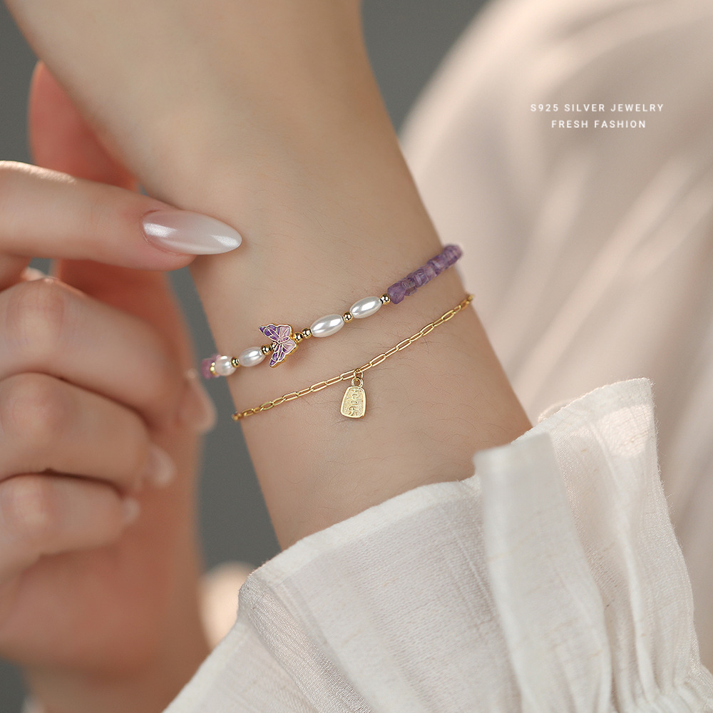 日本品质S925纯银叠戴风天然紫水晶手链女时尚小众设计感珍珠手链
