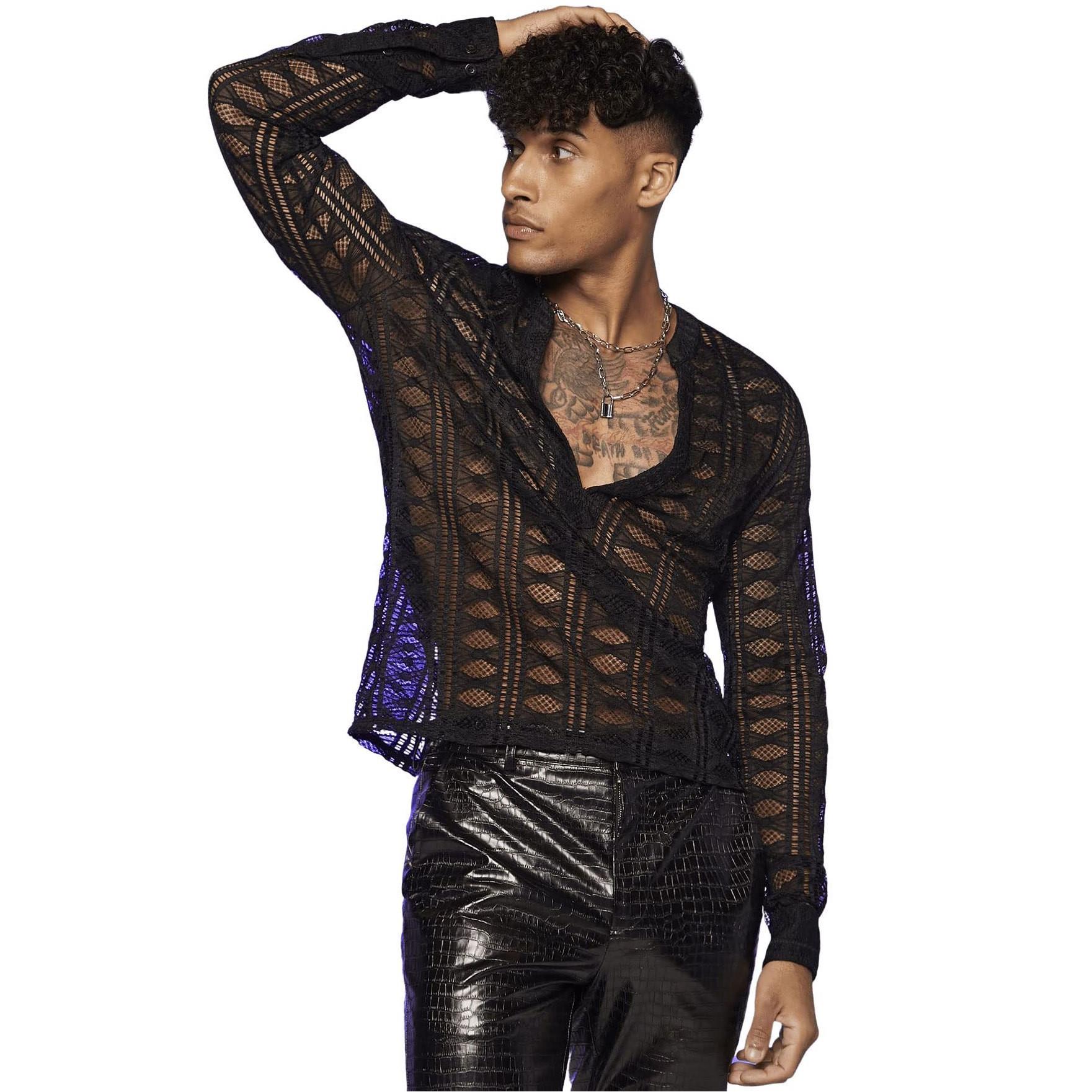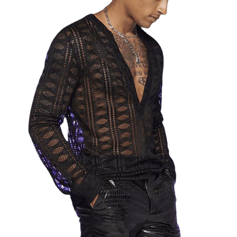 Sexy T-shirt 镂空蕾丝性感深V领T恤网眼透视夜店性感长袖上衣男