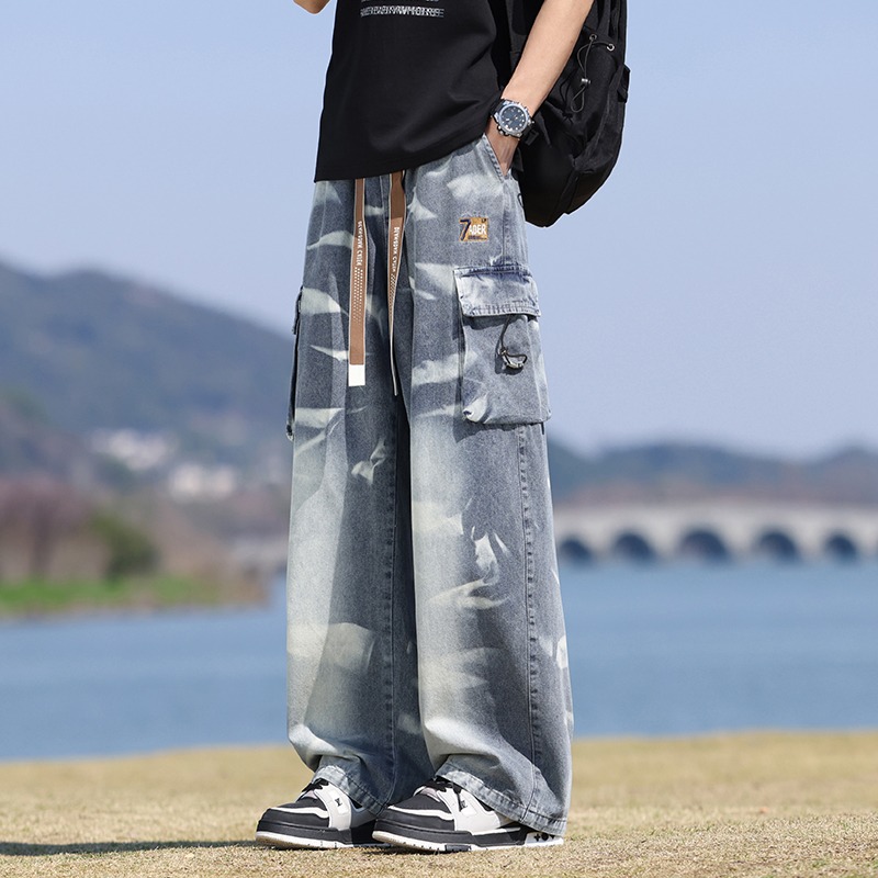 男士大码300斤迷彩工装牛仔裤男春秋季美式高街潮流vibe抽绳裤子