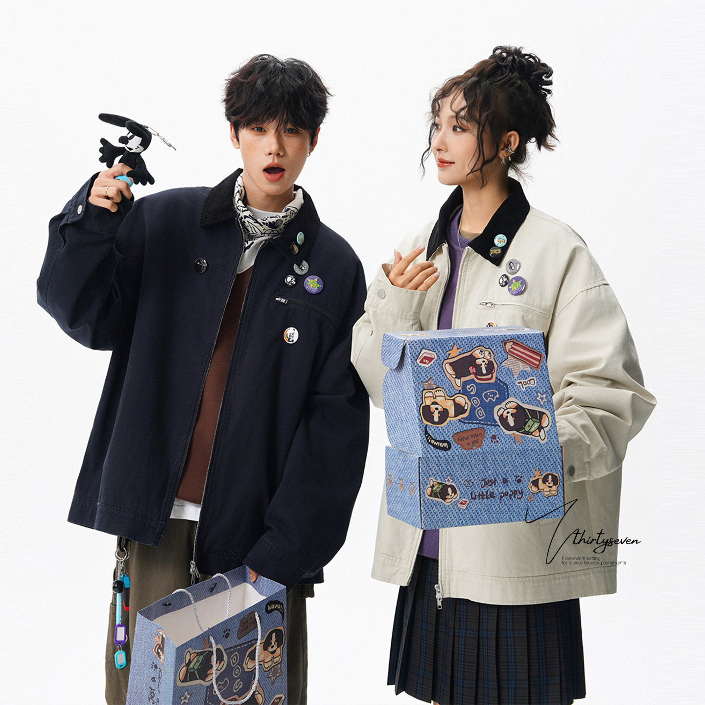 V37美式潮牌水洗帆布底特律夹克男款秋季高街痞帅灯芯绒翻领外套