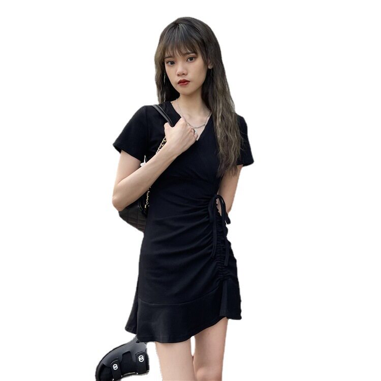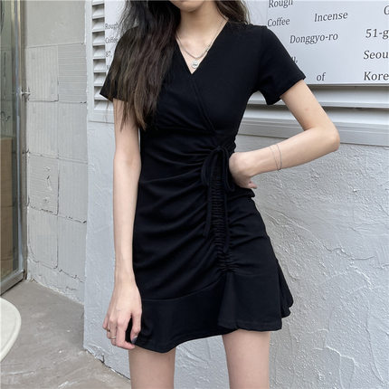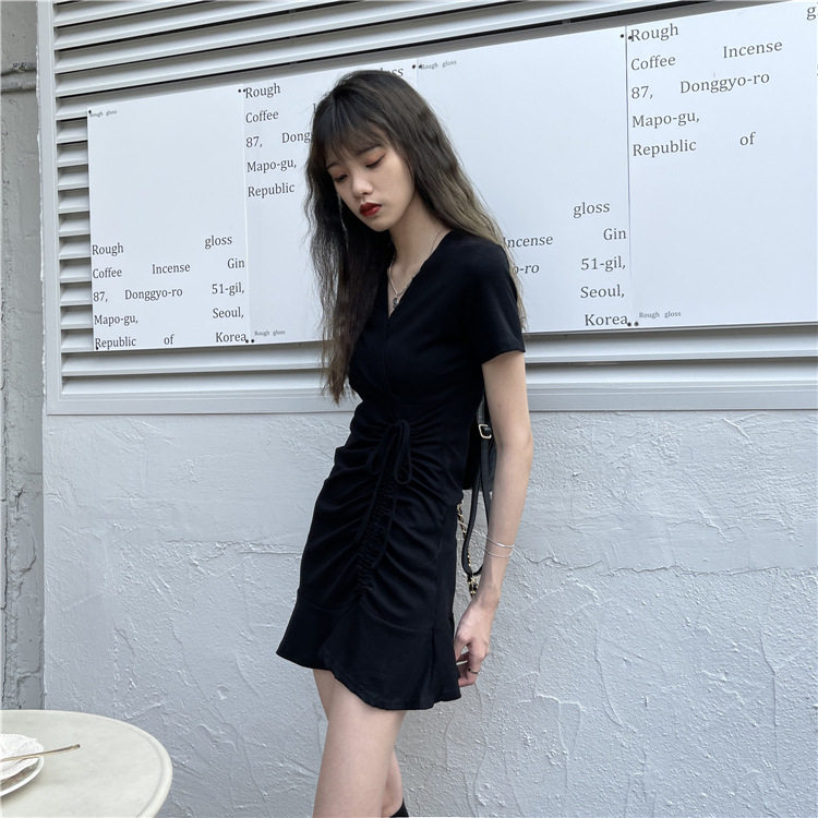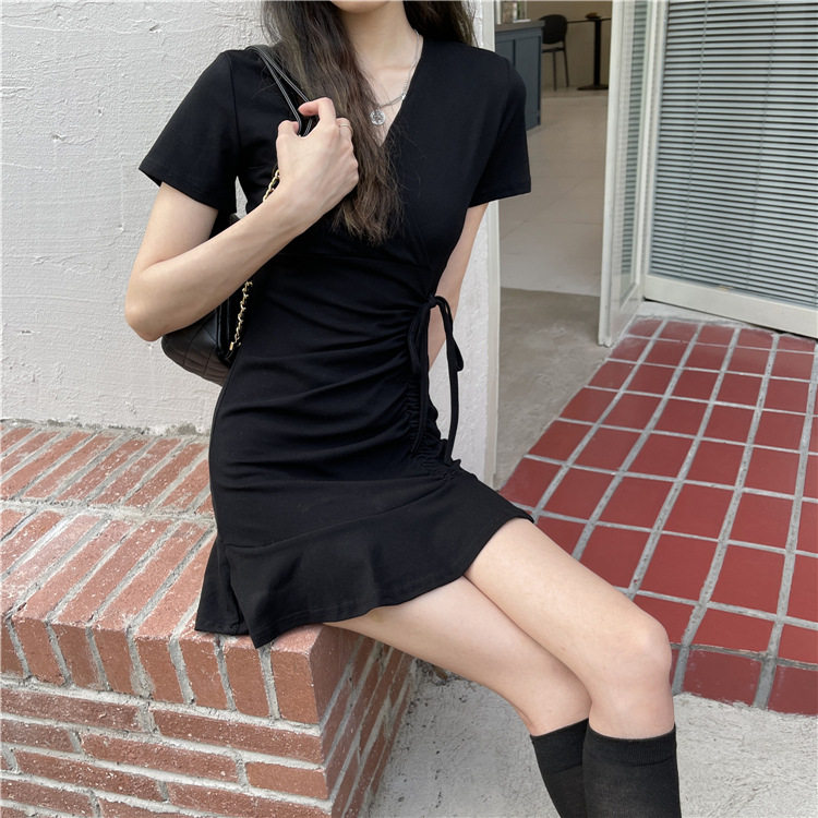 包臀裙连衣裙夏季2023新款收腰V领抽绳短袖闺蜜装裙子小黑裙女装