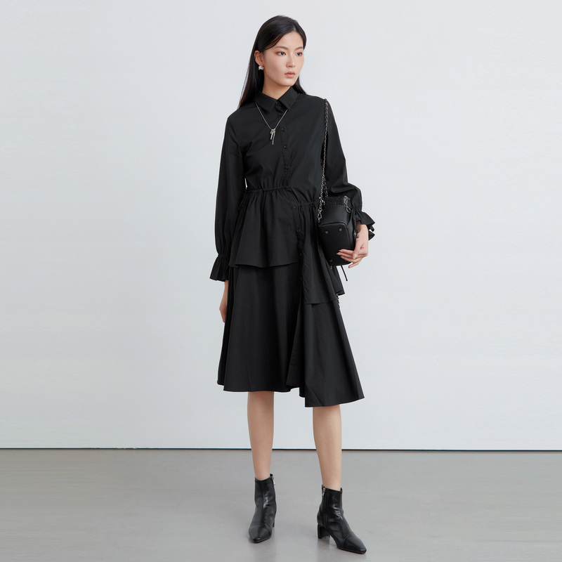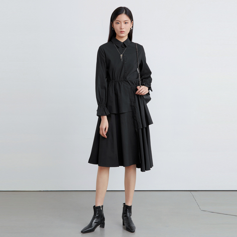 sdeer圣迪奥女装翻领收腰不规则衬衫连衣裙S214Z1227