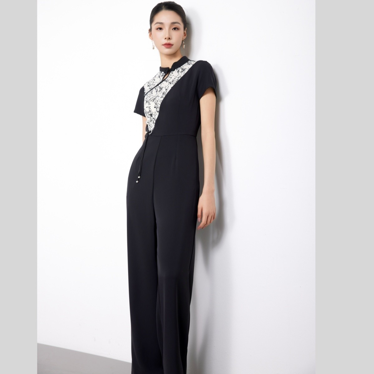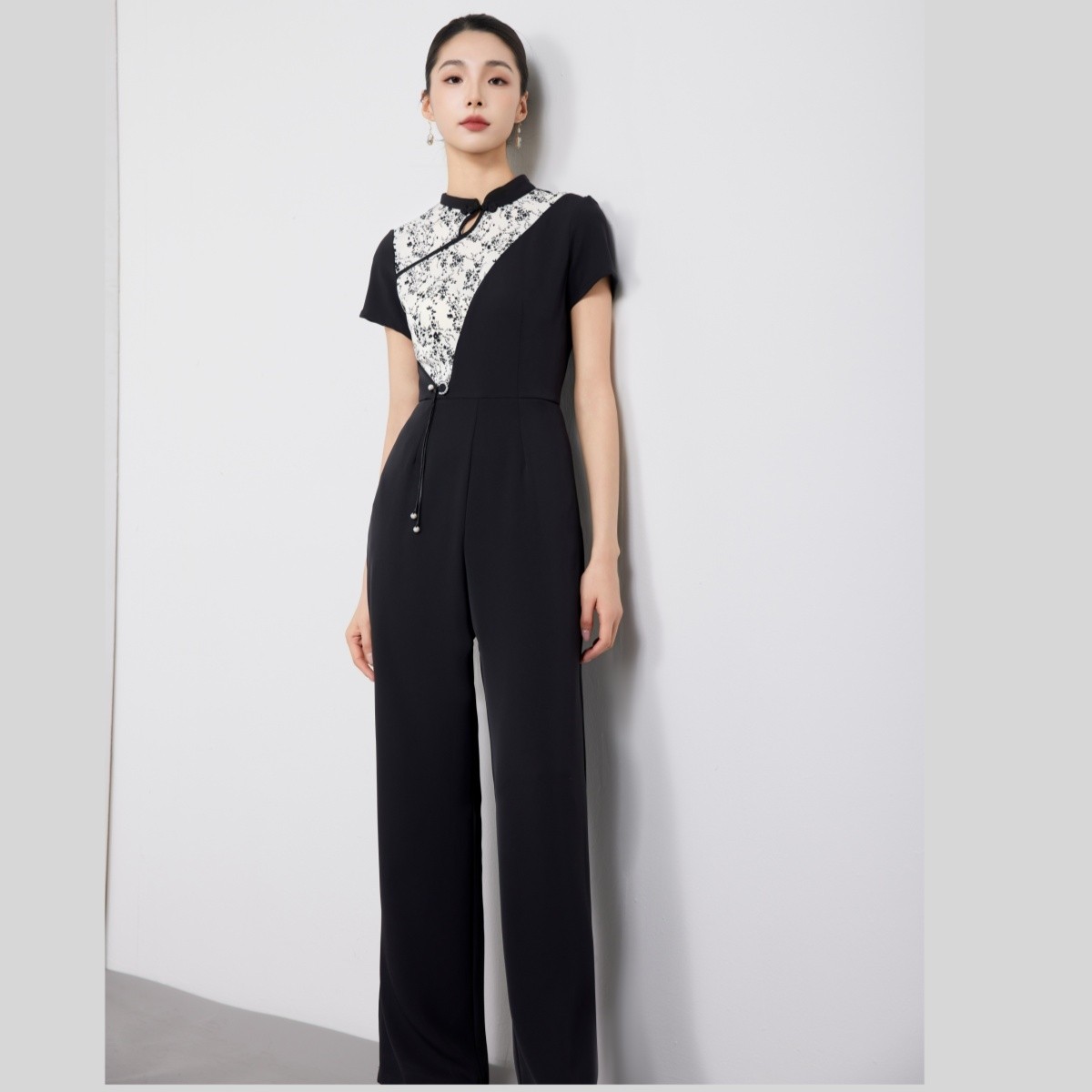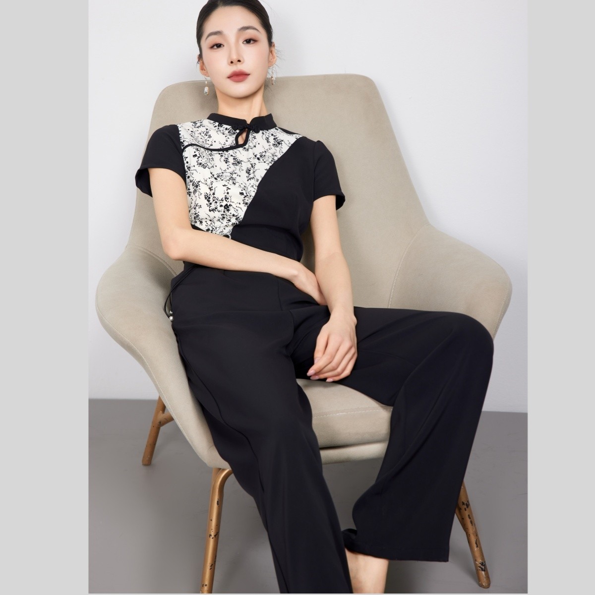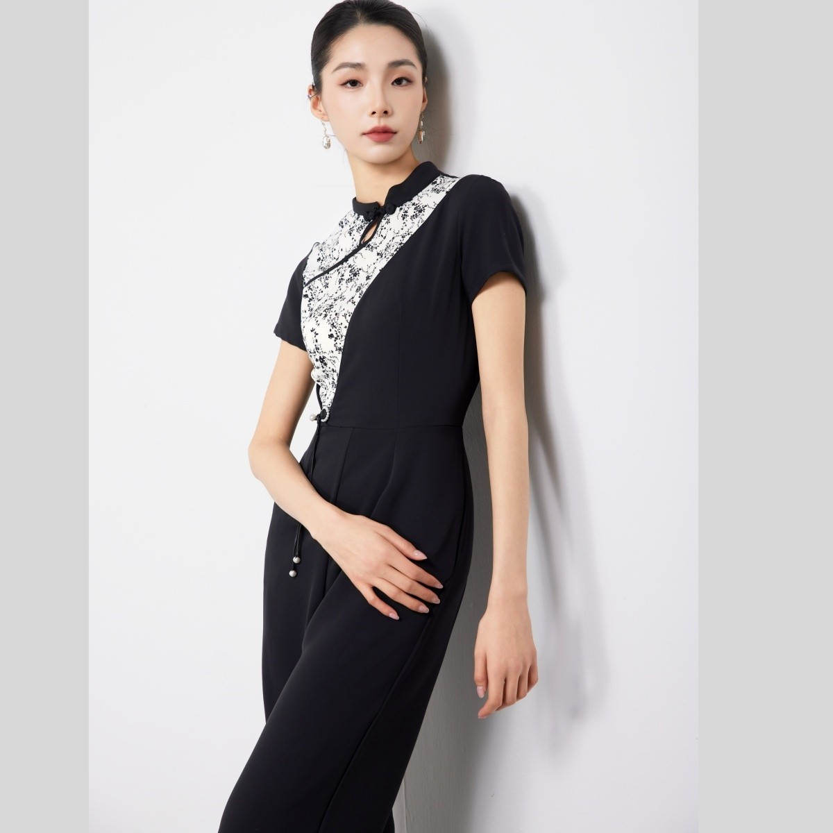 新中式风气质修身花色拼接立领旗袍款短袖垂坠感连体裤女夏裤裙