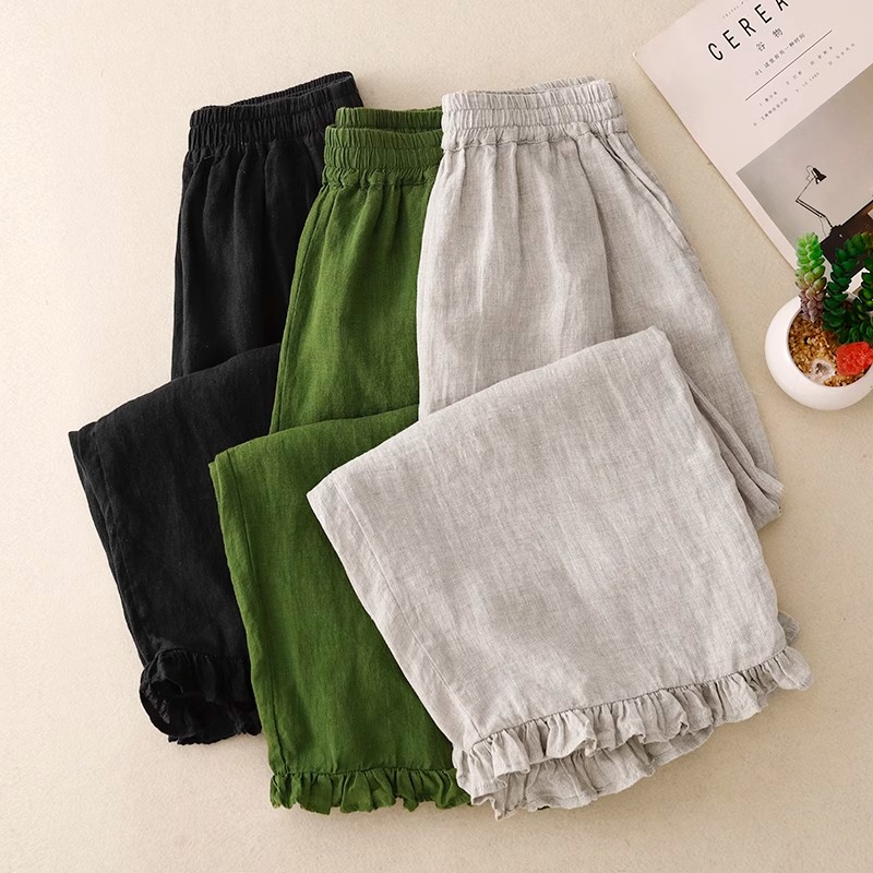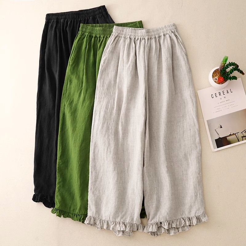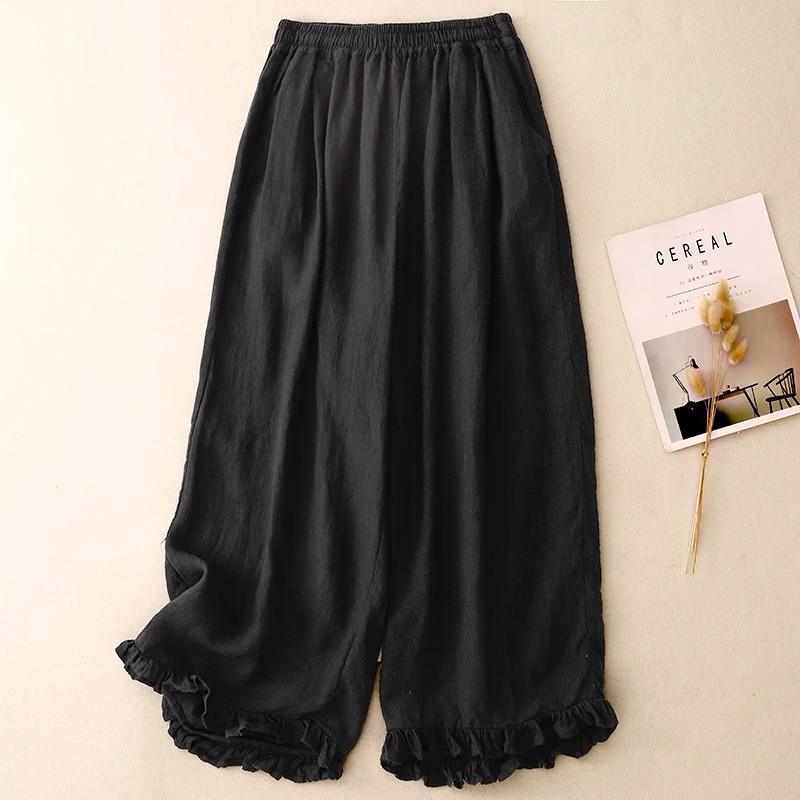 复古小众木耳花边拼接阔腿裤女夏季新款松紧腰宽松百搭九分休闲裤