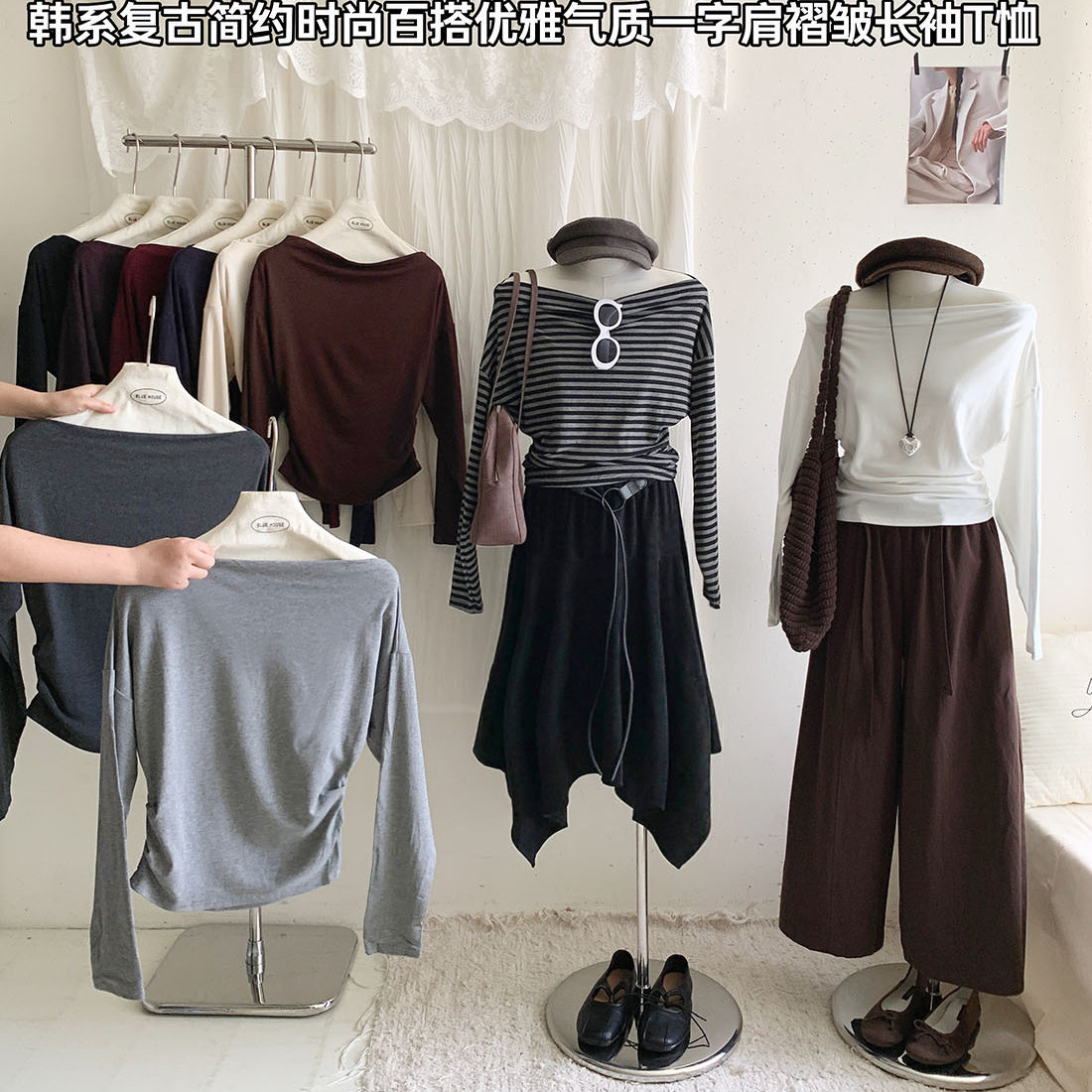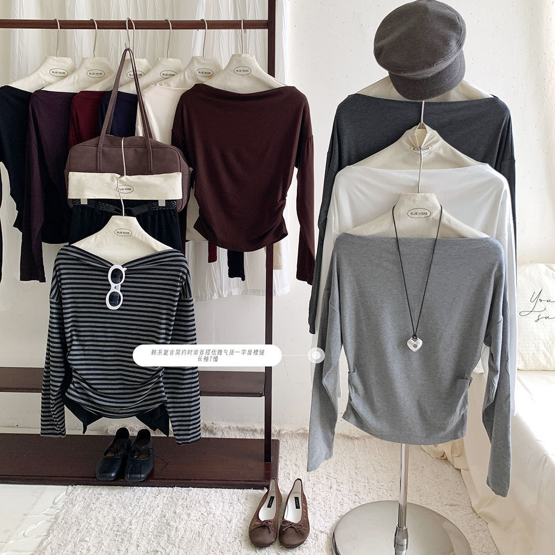 法式气质条纹一字领斜露肩T恤女秋抽复古褶皱收腰洋纯欲显瘦上衣