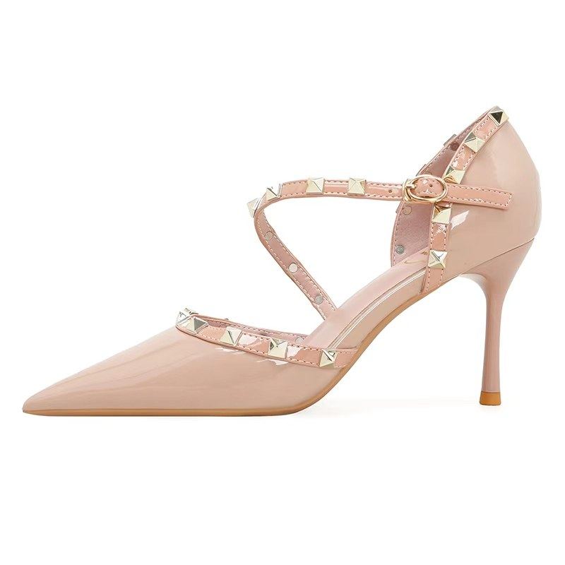尖头细跟一字带性感御姐包头单鞋绝美配裙子裸色铆钉法式高跟鞋女