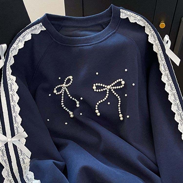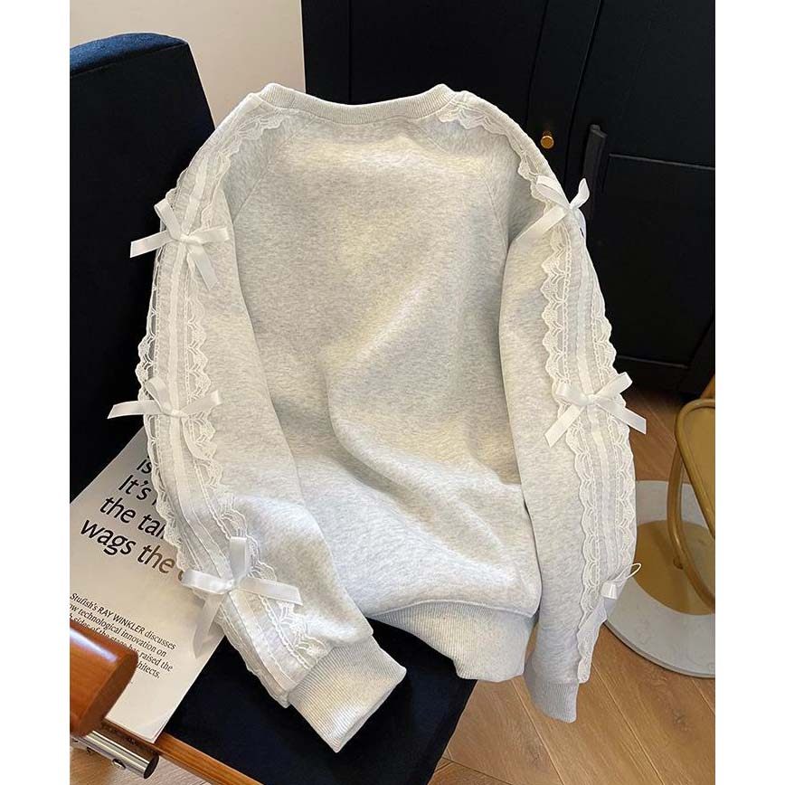 蕾丝拼接钉珠蝴蝶结套头加绒卫衣