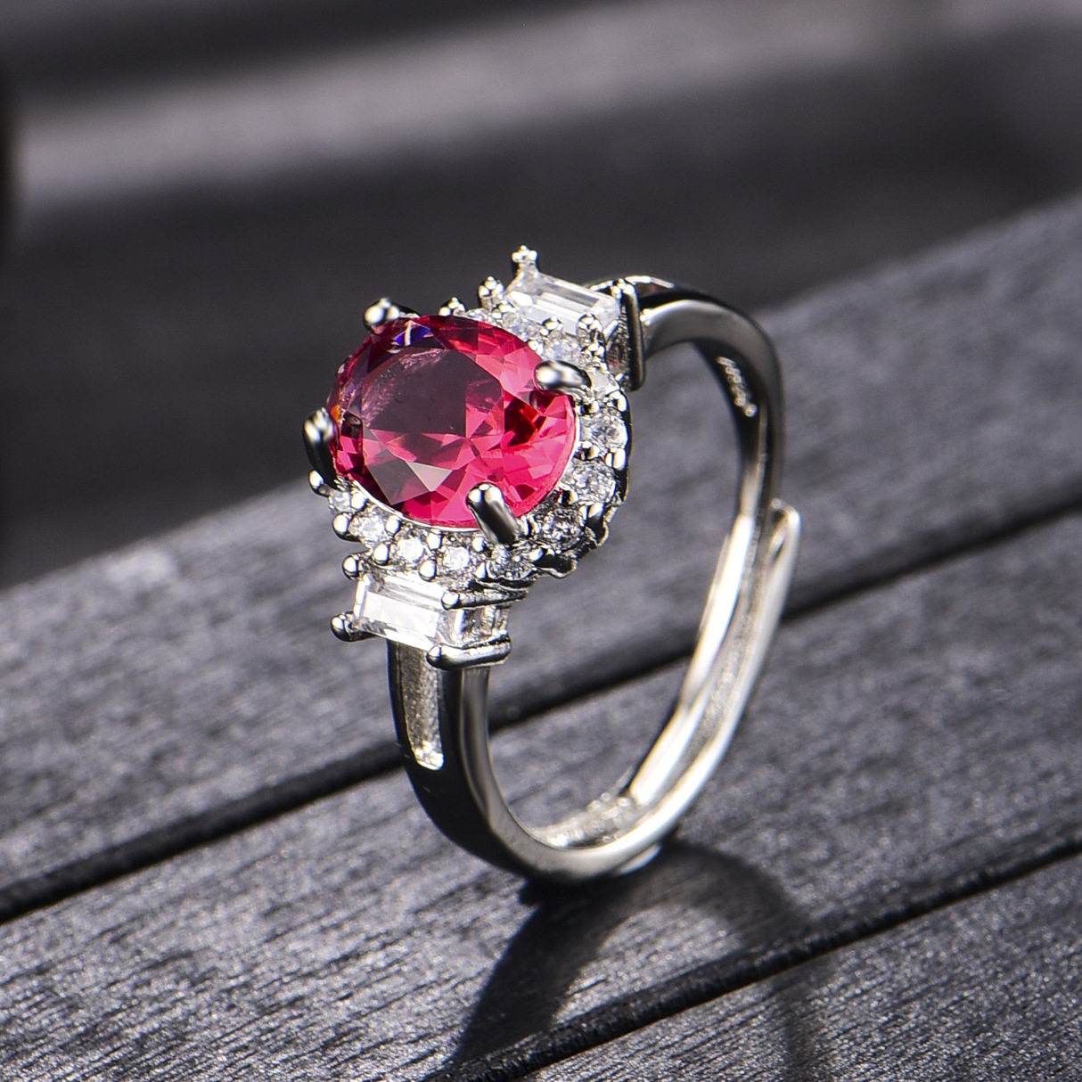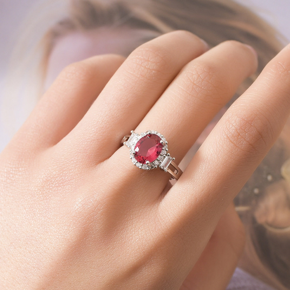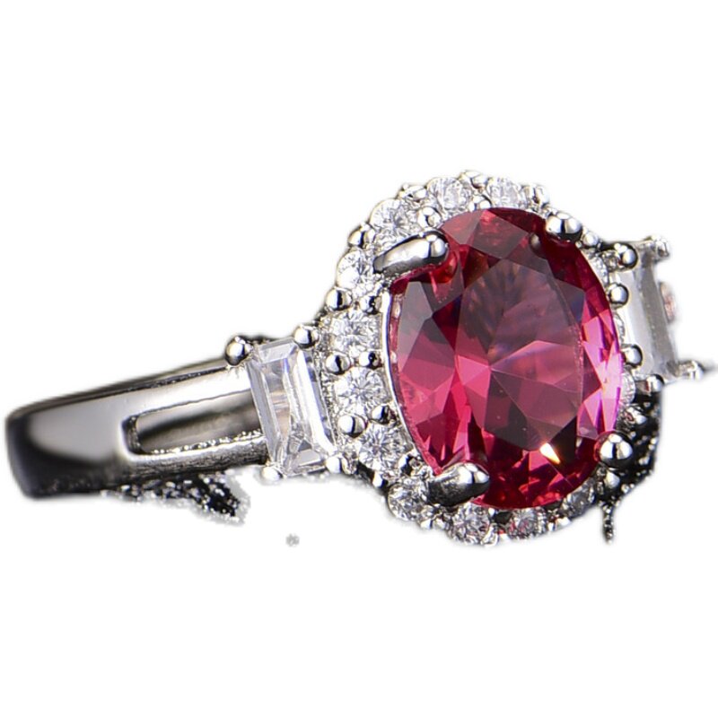 欧美高端珠宝少女简约椭形仿真红碧玺宝石镶钻镀白金戒指结婚钻戒
