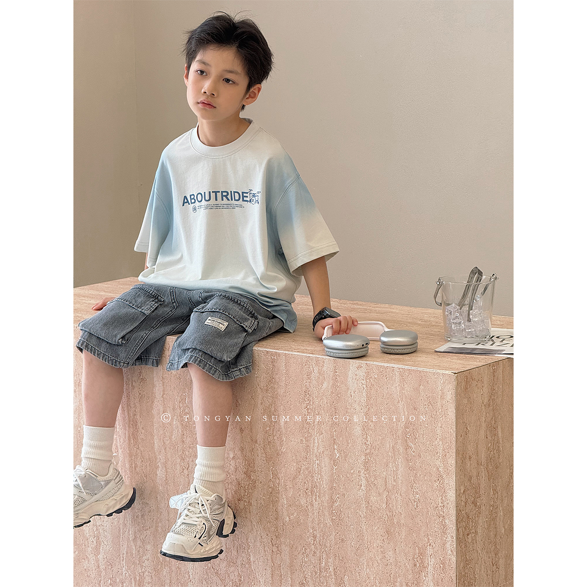 男童短袖T恤2025夏装新款自制宽松儿童半袖渐变色薄款T中大童上衣