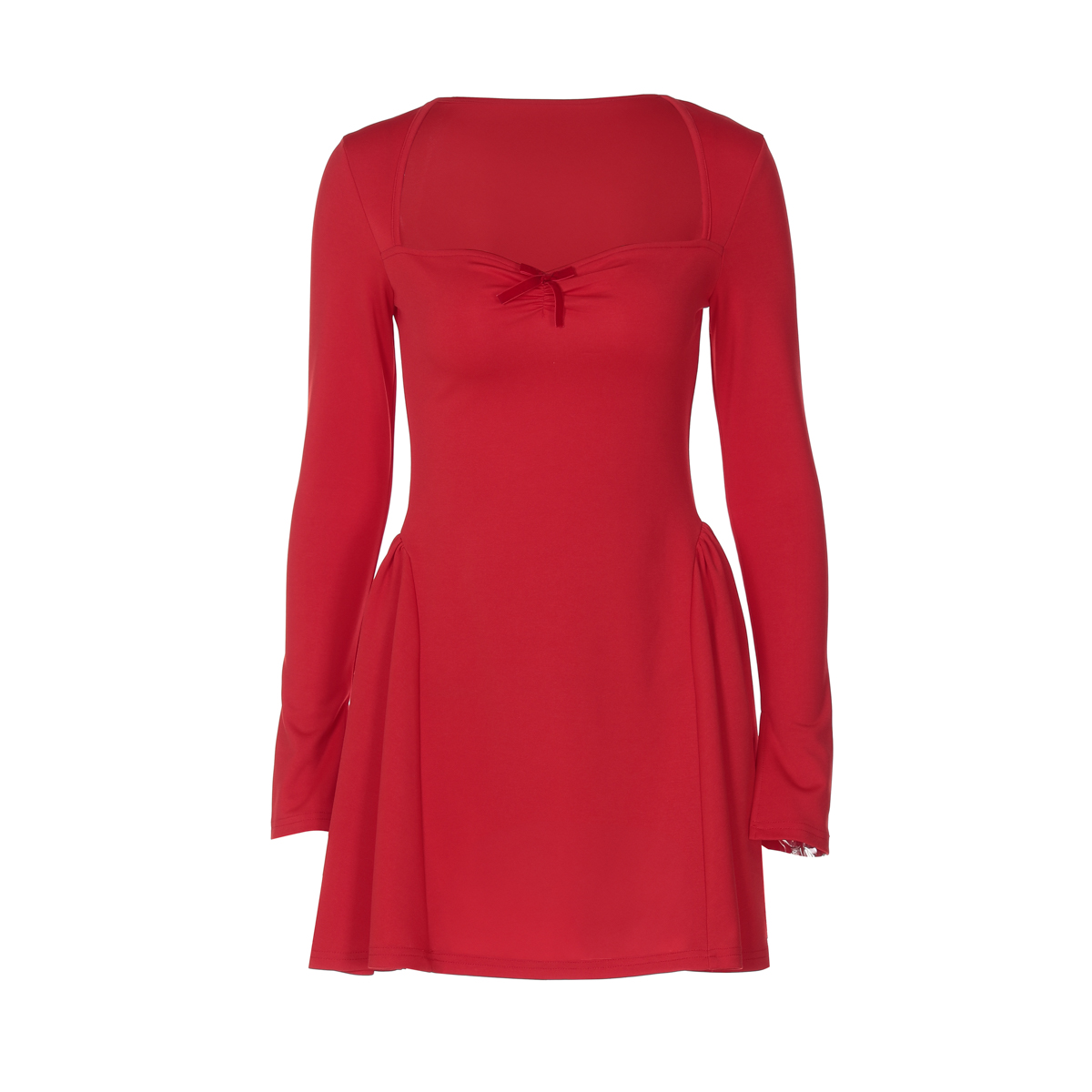 欧美风性感方领褶皱扎花长袖连衣裙女早秋新款拼接高腰修身一步裙