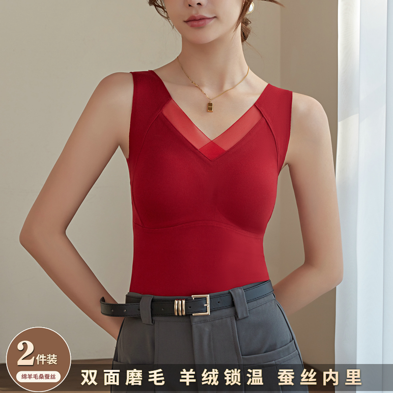 桑蚕丝保暖背心女上衣内搭秋冬加绒加厚带胸垫一体式打底发热内衣