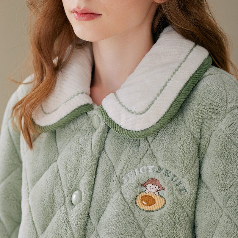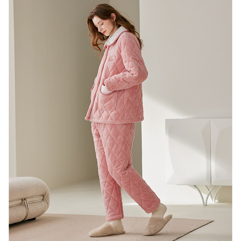 芬腾女士珊瑚绒睡衣冬季三层加厚夹棉袄套装加绒抗静电休闲家居服