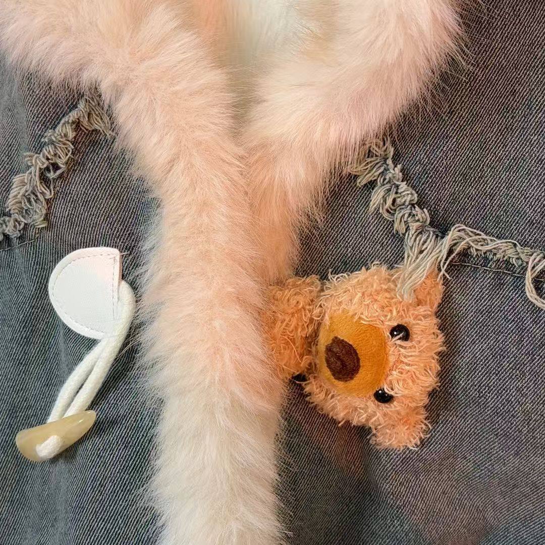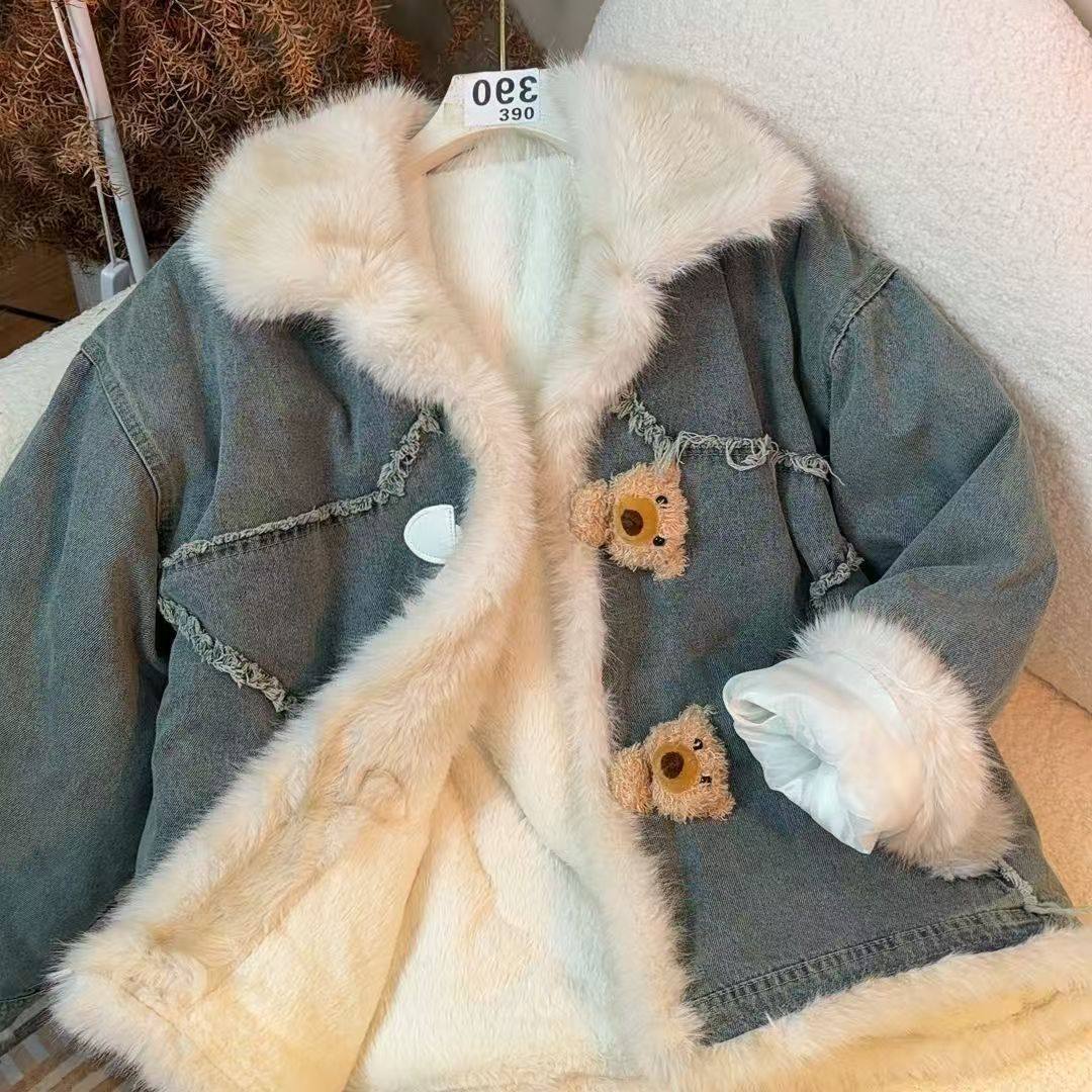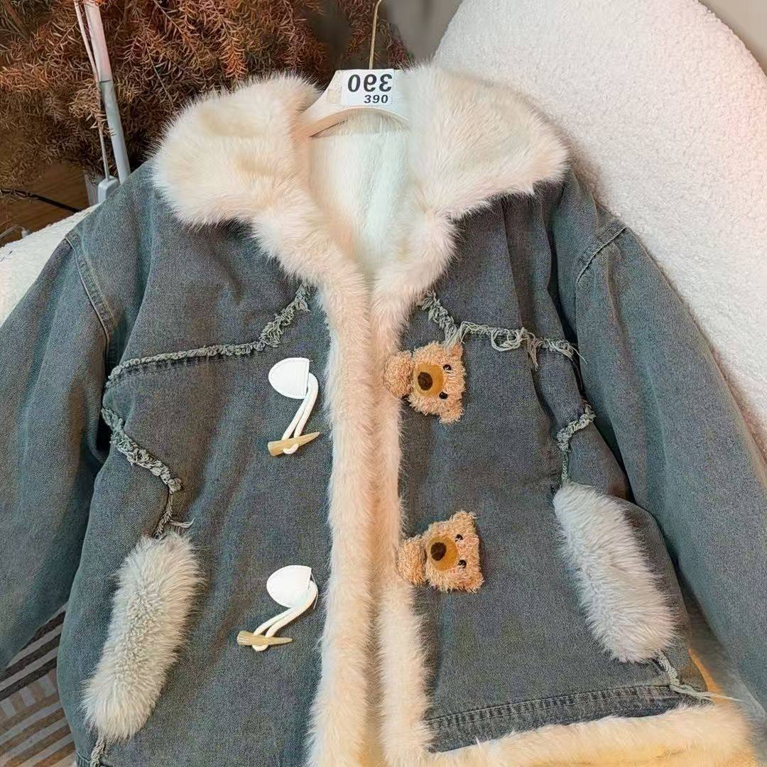 韩系拼接毛领加绒加厚牛仔外套女