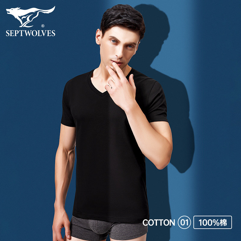 七匹狼男士短袖内衣v领t恤男款背心纯棉全棉打底上衣夏季半袖汗衫