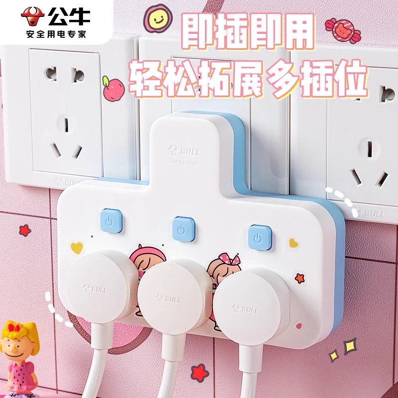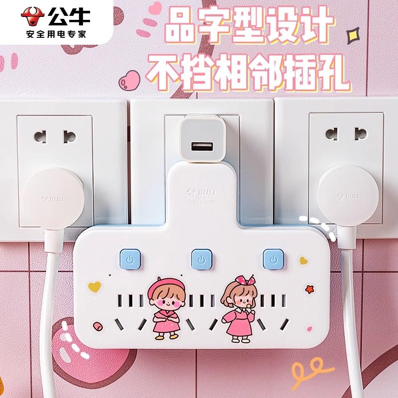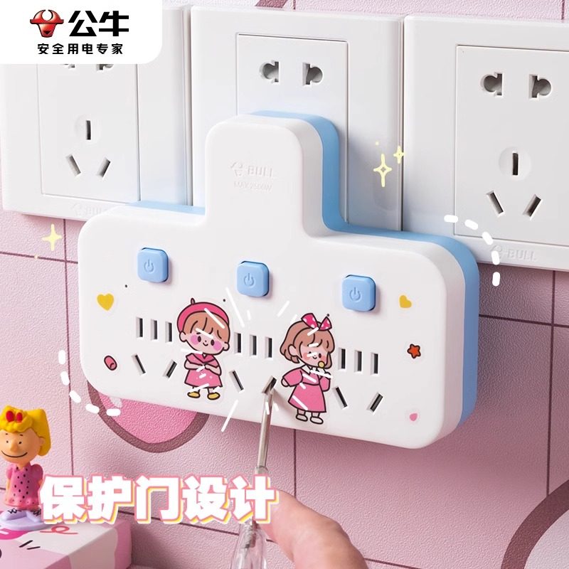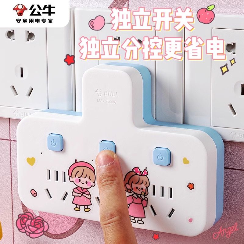 公牛插座多孔转换器插头学生宿舍一转二可爱插排独立开关插线板