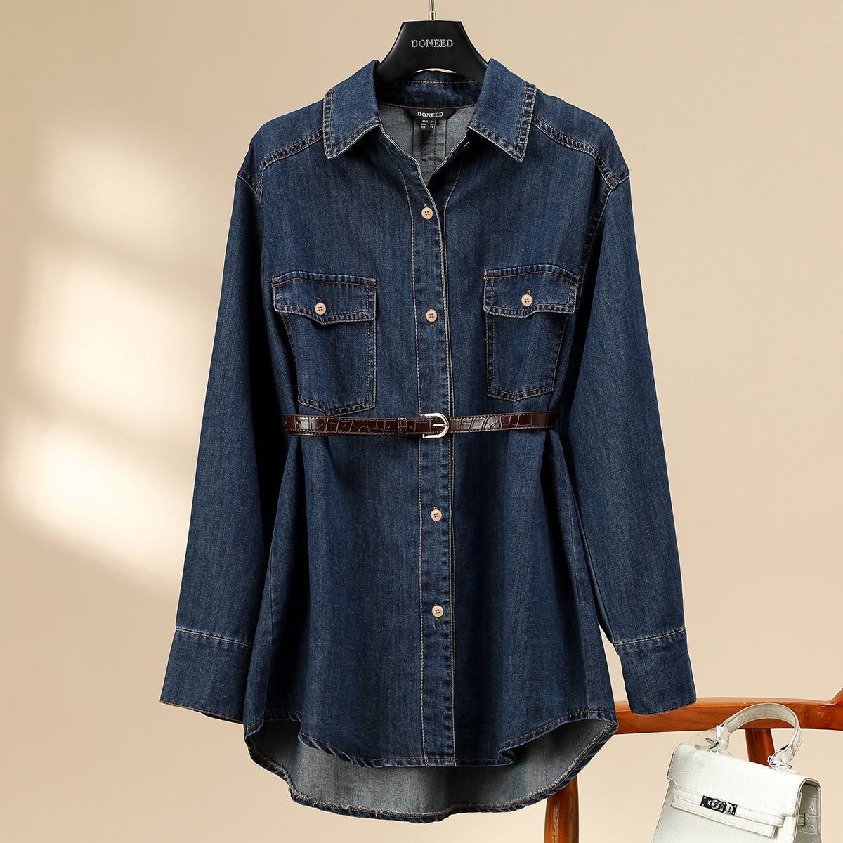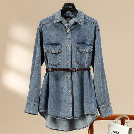 DONEED2025春秋复古水洗牛仔衬衫女韩版配腰带上衣外套