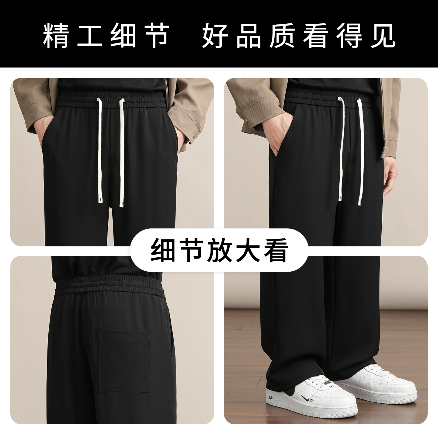 罗蒙抽绳西裤男秋季垂坠感抗皱免烫黑色西装裤直筒宽松系绳休闲裤
