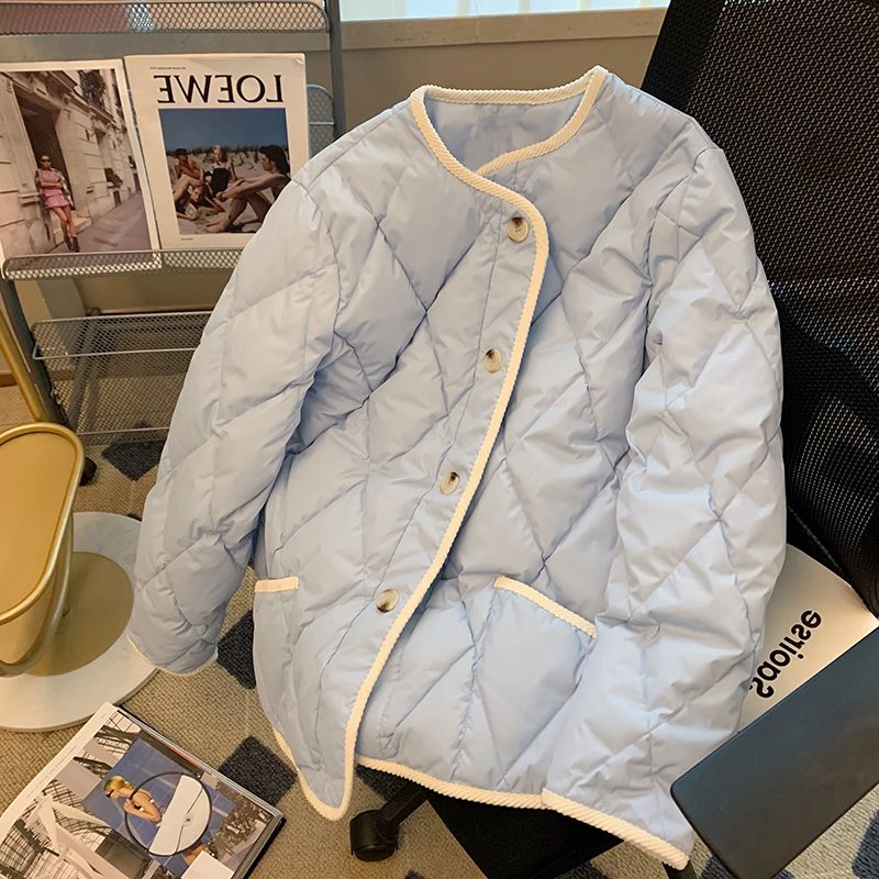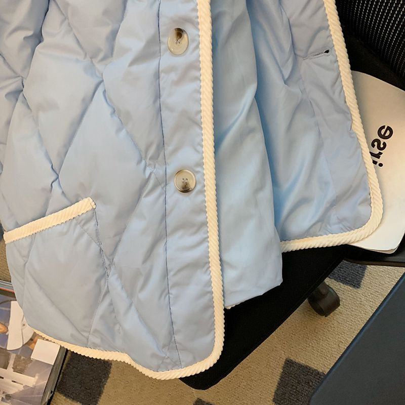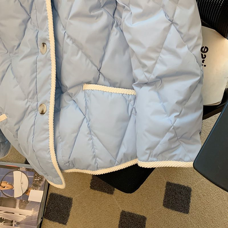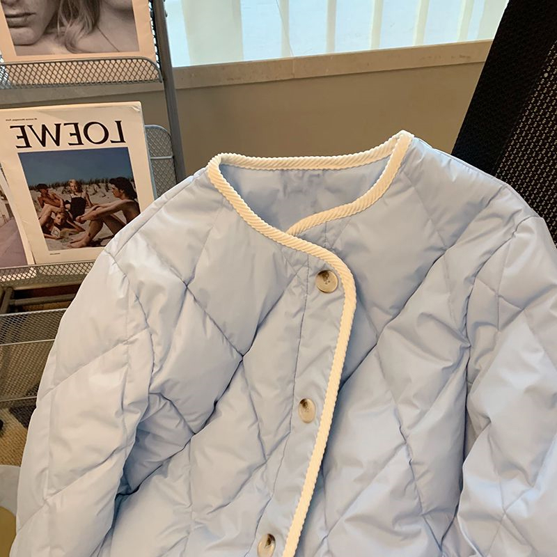 300斤特大码女装高级感蓝色菱格棉服女胖mm秋冬时尚短款棉袄外套