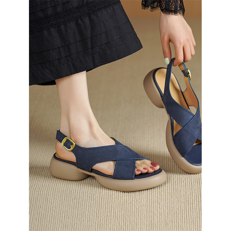 凉鞋女夏季2025软底圆头中跟平底粗跟真皮蓝色厚底杏色40一字扣带