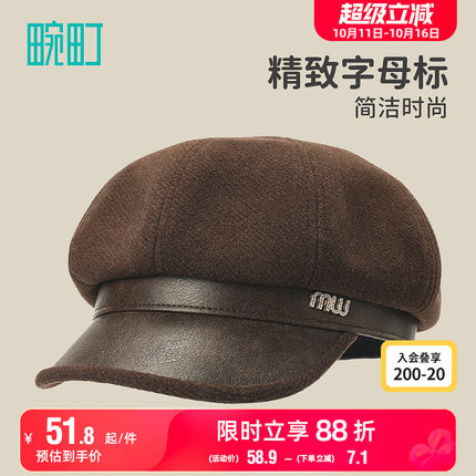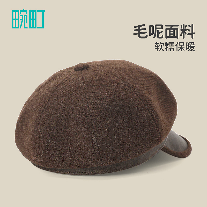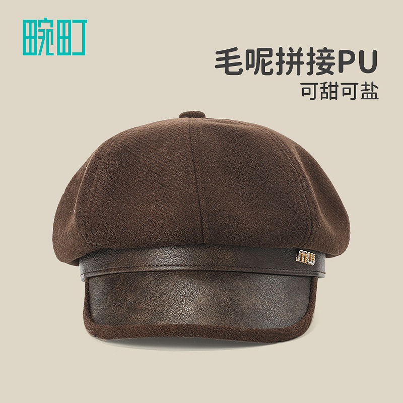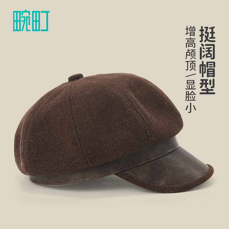 畹町毛呢八角帽女秋冬季复古棕雅丹风鸭舌贝雷帽简约报童画家帽子