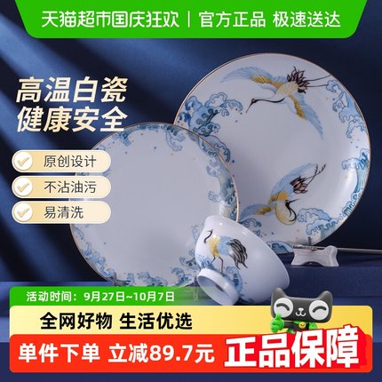 景德镇陶瓷高端中式仙鹤餐具整套新国潮家用送礼高温白瓷碗碟套装