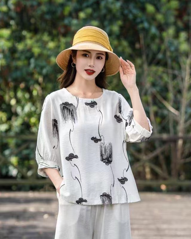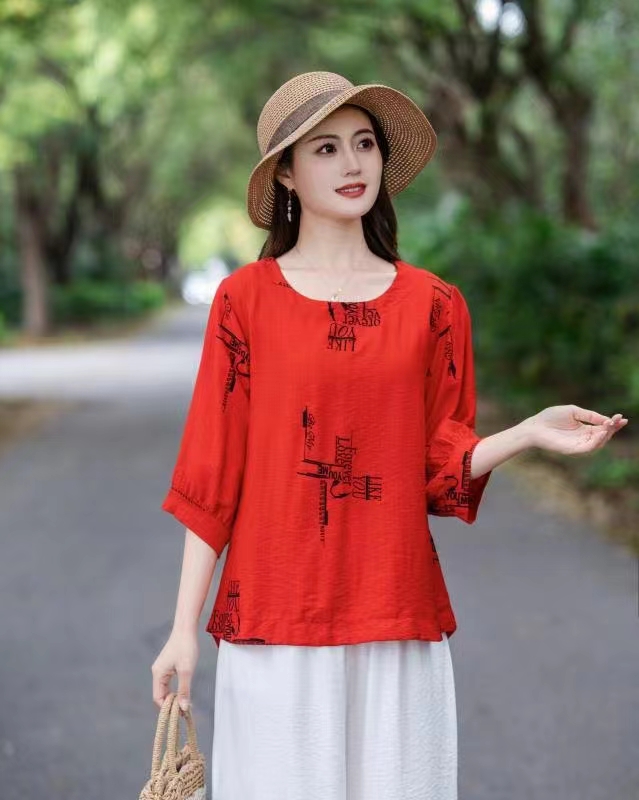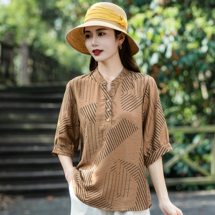 复古民族风棉麻短袖衬衫夏装五分袖格子T恤文艺休闲百搭套头上衣