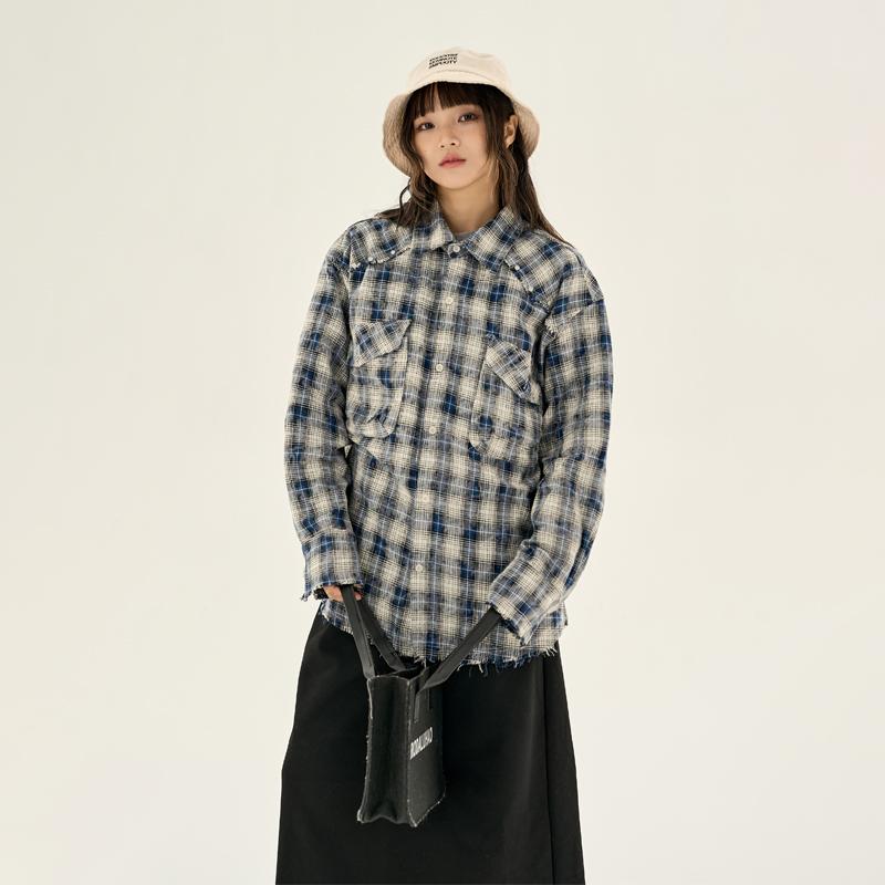 美式复古破坏毛边格子衬衫女中性慵懒风高级宽松休闲长袖衬衣上衣