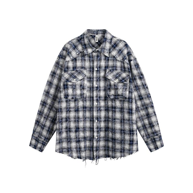 美式复古破坏毛边格子休闲衬衫