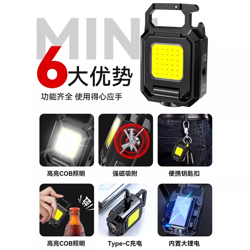 多功能钥匙扣灯双面COB强磁吸户外充电露营帐篷便携迷你小手电筒