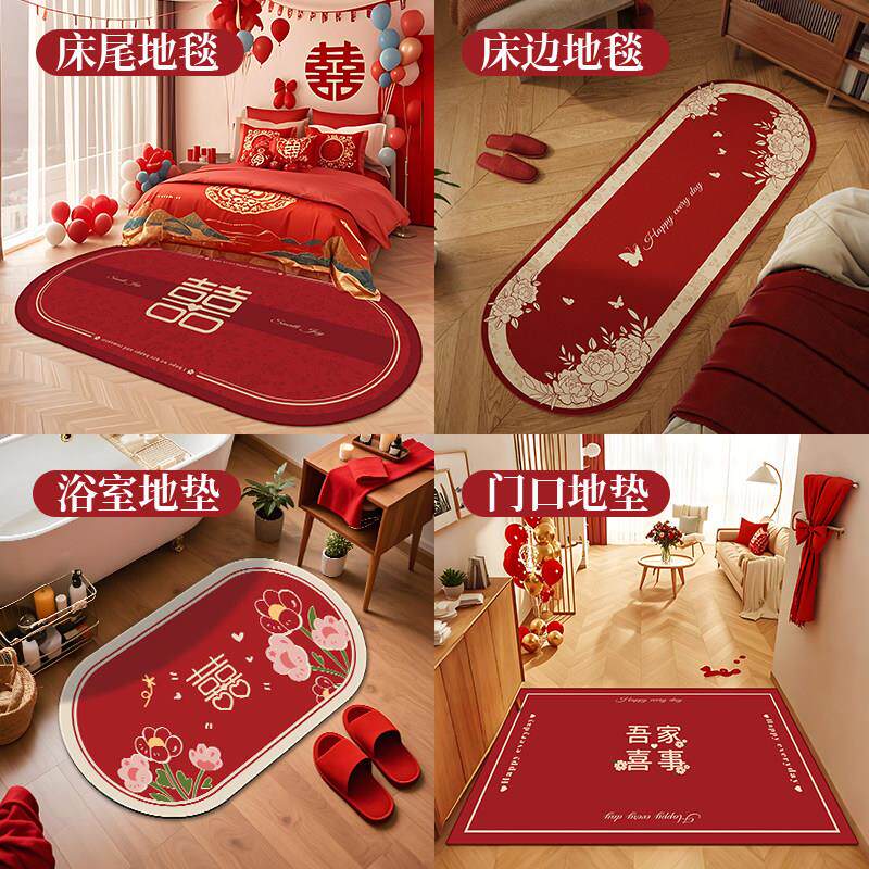 结婚床边毯家用红色喜庆装饰前地毯婚房布置床喜字飘窗垫卧室地垫