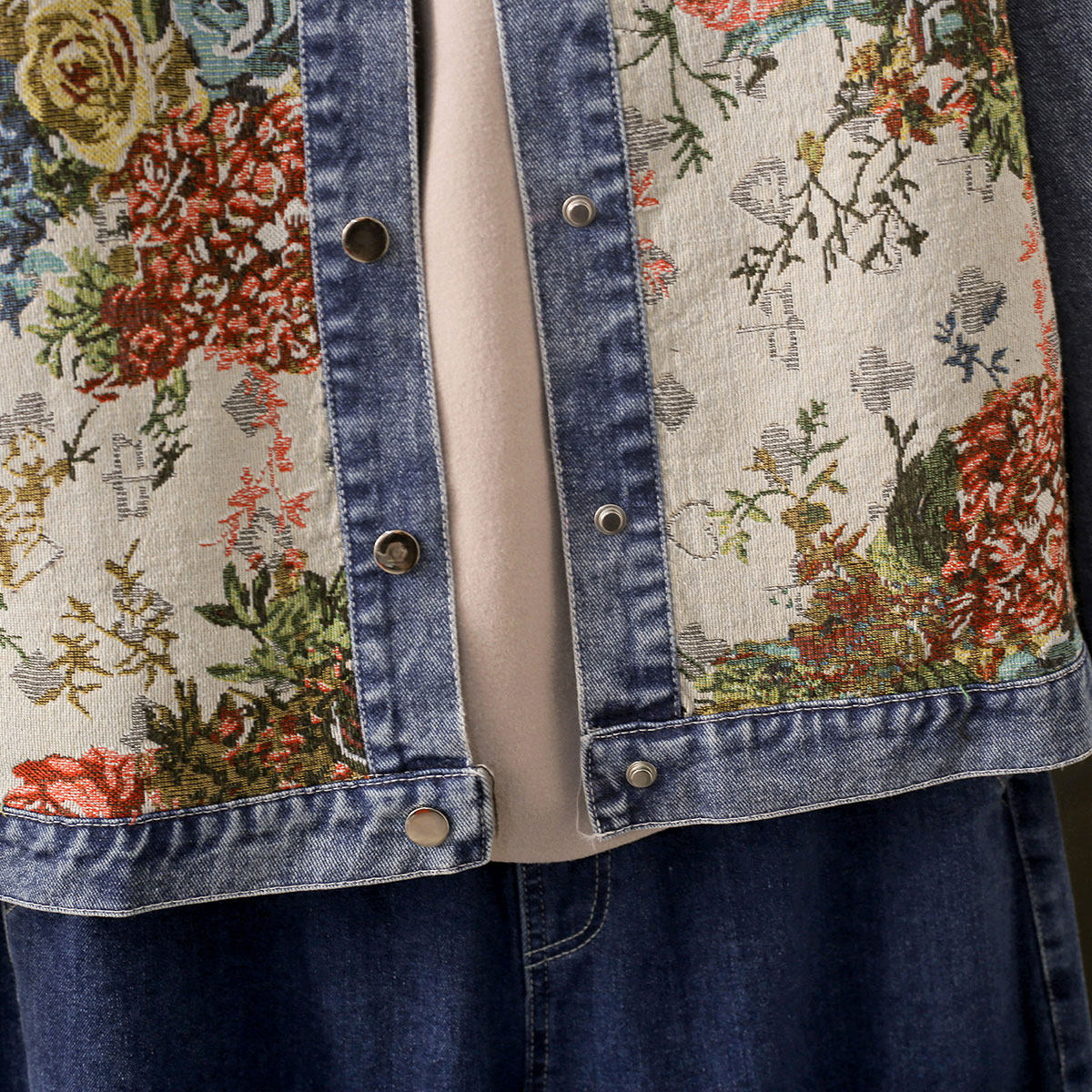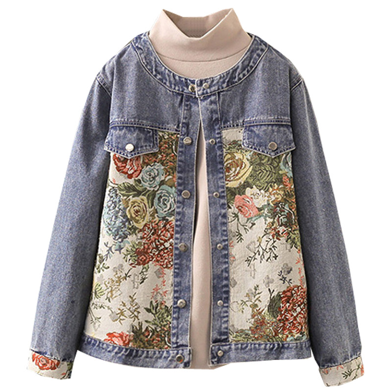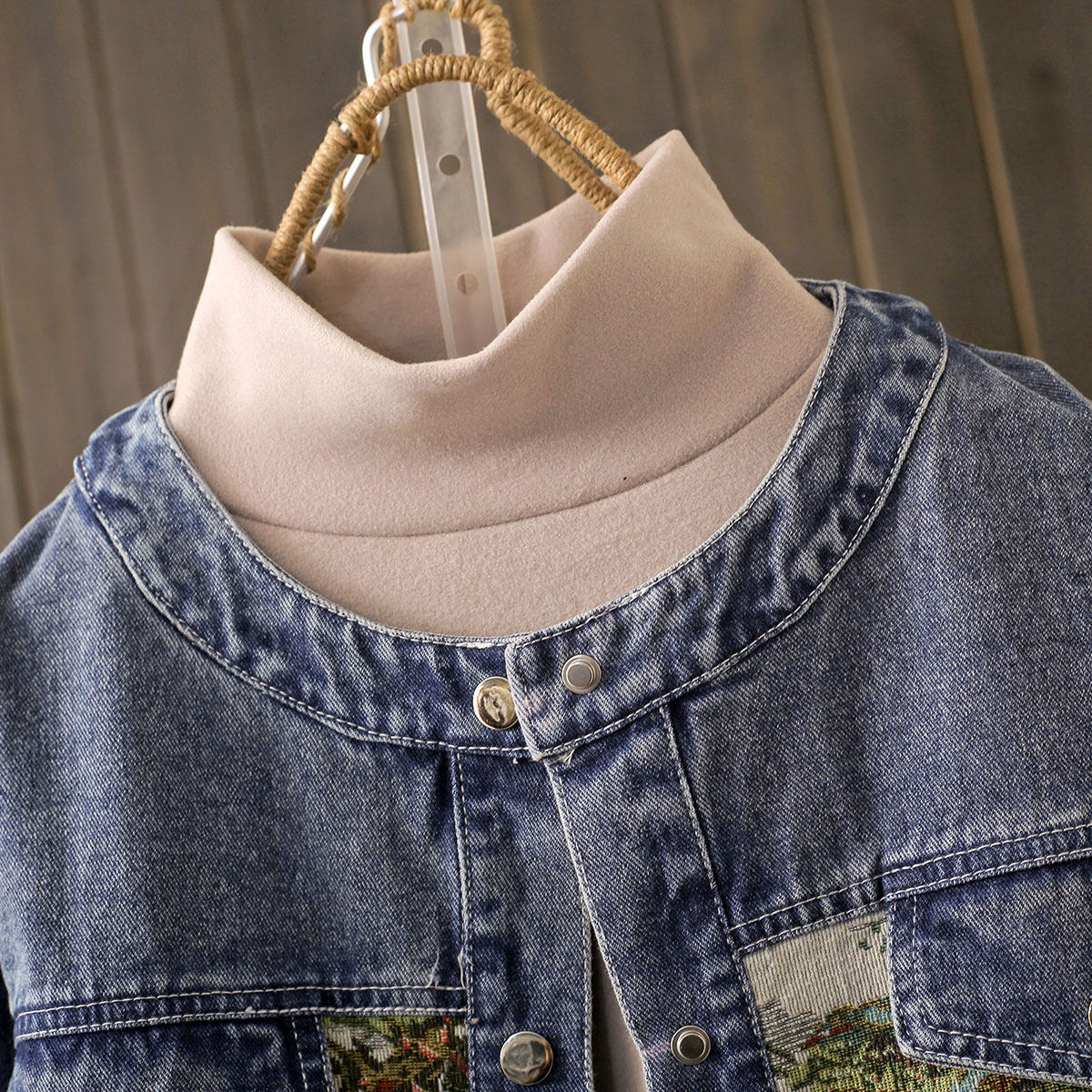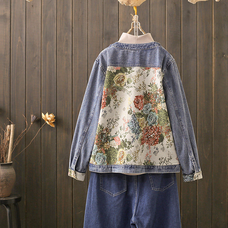 春秋大码200斤国风绣花拼接长袖翻领牛仔外套短款小个子上衣夹克
