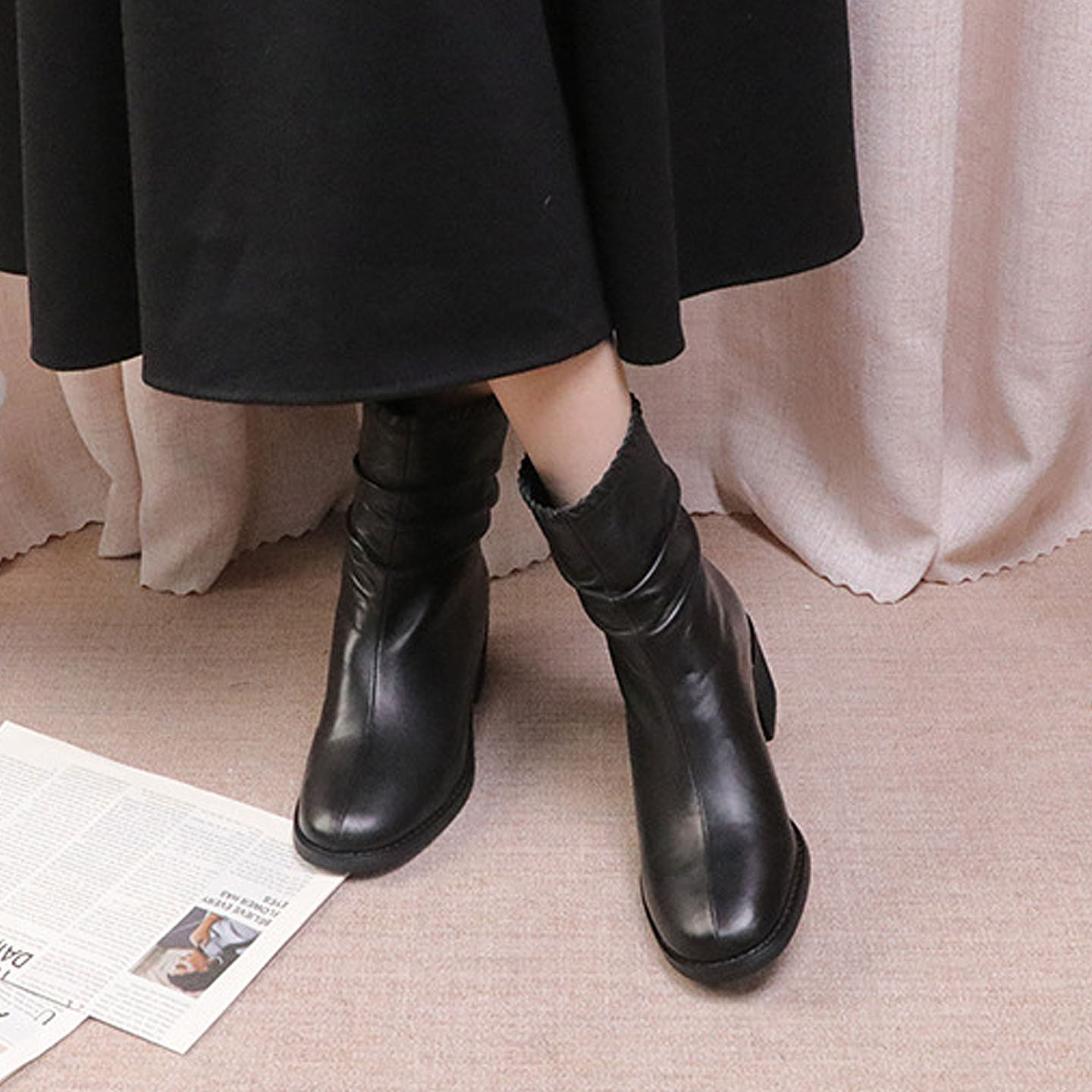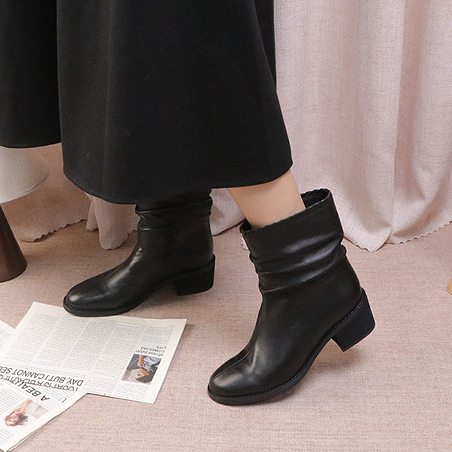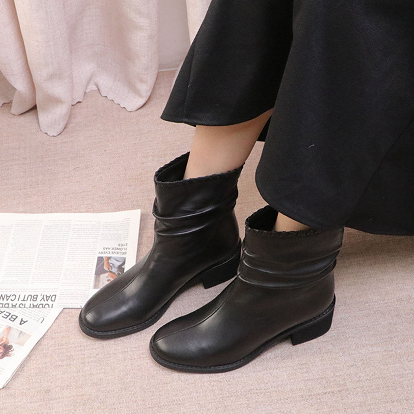 英伦风羊皮短靴秋冬新款粗跟软底褶皱堆堆靴黑色马丁靴手工女鞋子
