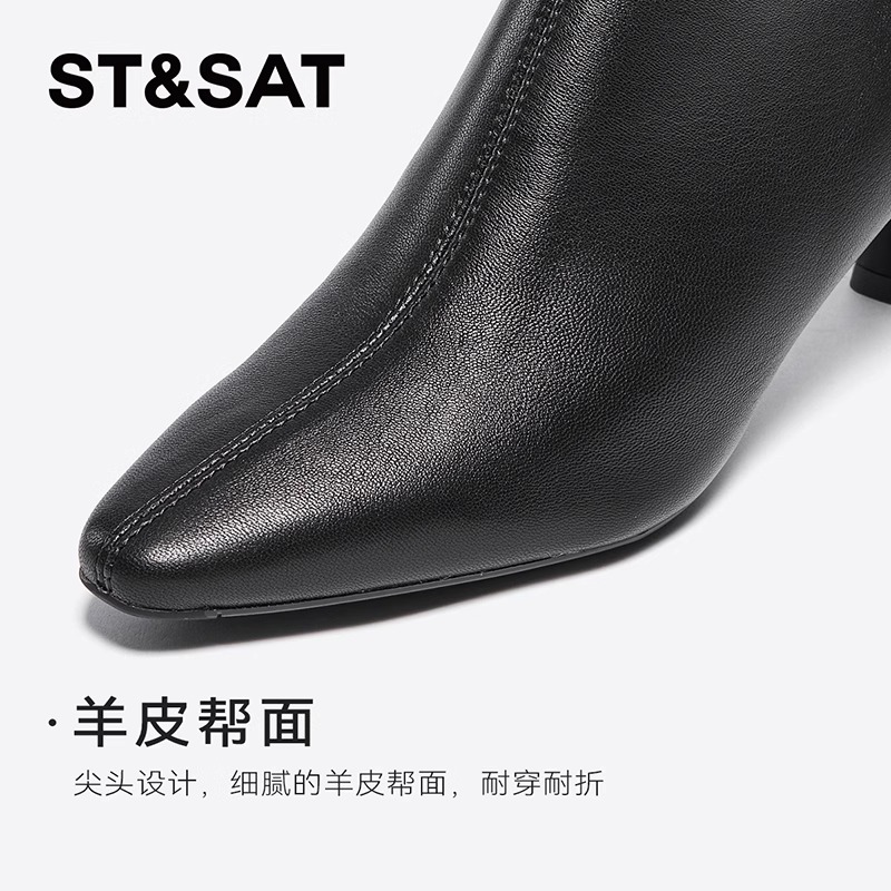 星期六羊皮短靴女冬新款气质女王尖头瘦瘦靴细高跟职业正装时装靴