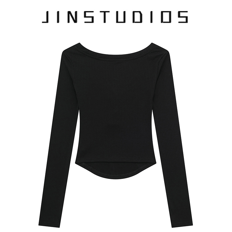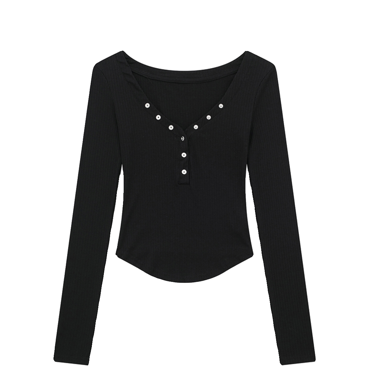 JIN自制2024春纯欲辣妹风个性金属扣V领长袖T恤修身百搭显瘦上衣