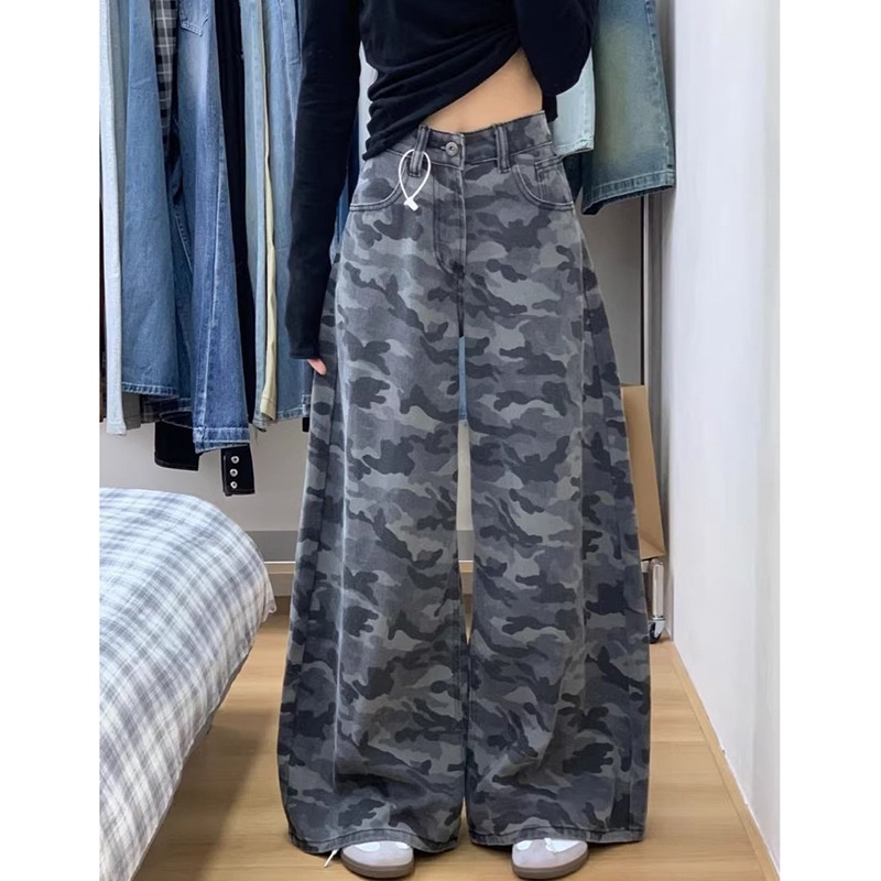 8004美式中性迷彩工装阔腿牛仔裤女春秋垂感ins拖地牛仔裤潮