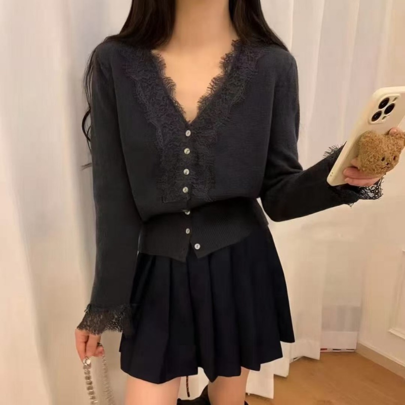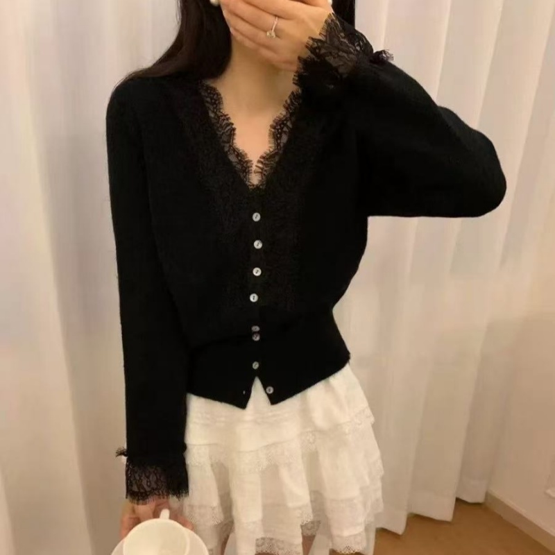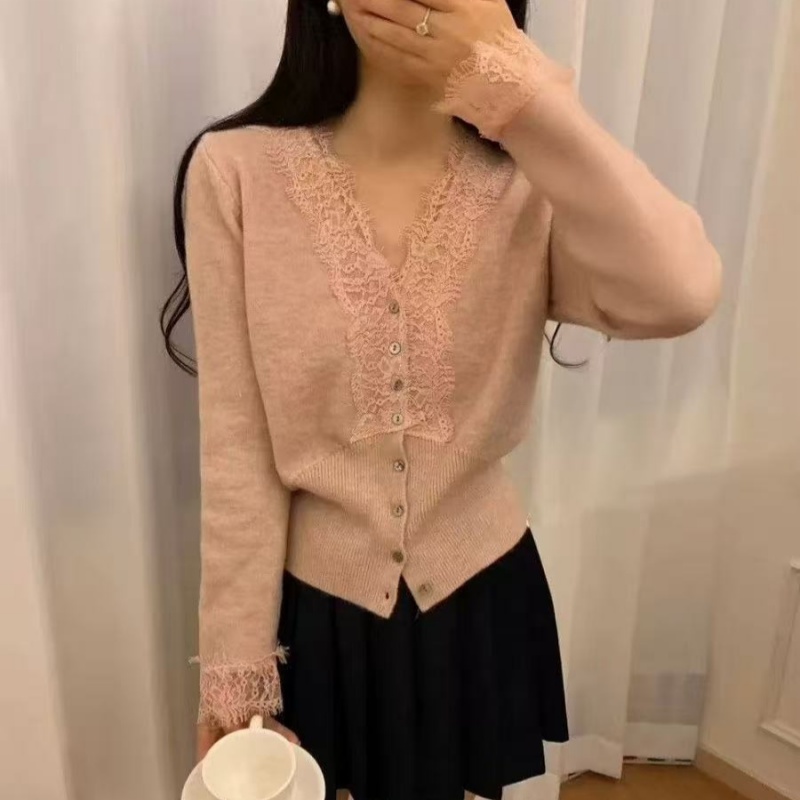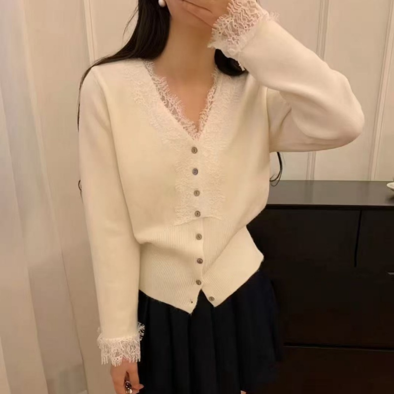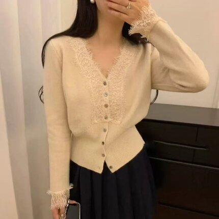 2025春秋V领开衫针织女外套设计感小众蕾丝拼接毛衣内搭打底上衣